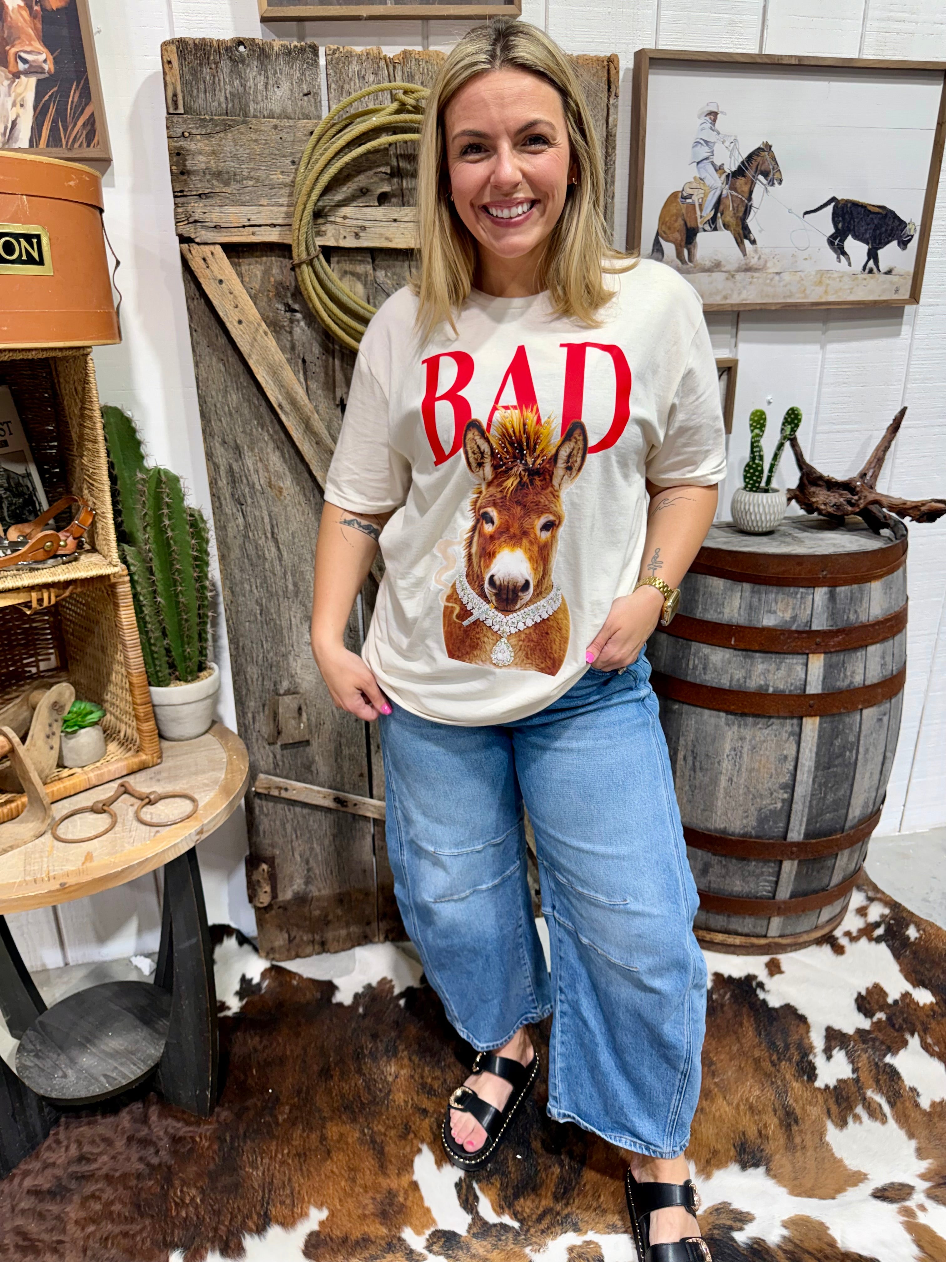 Featuring a hilarious yet fierce donkey rocking a rhinestone-studded mane and statement jewelry, this graphic tee is the perfect mix of funny, western, and bougie—just like your brand. The oversized red “BAD” lettering makes it a standout piece for any cowgirl who isn’t afraid to show a little sass.