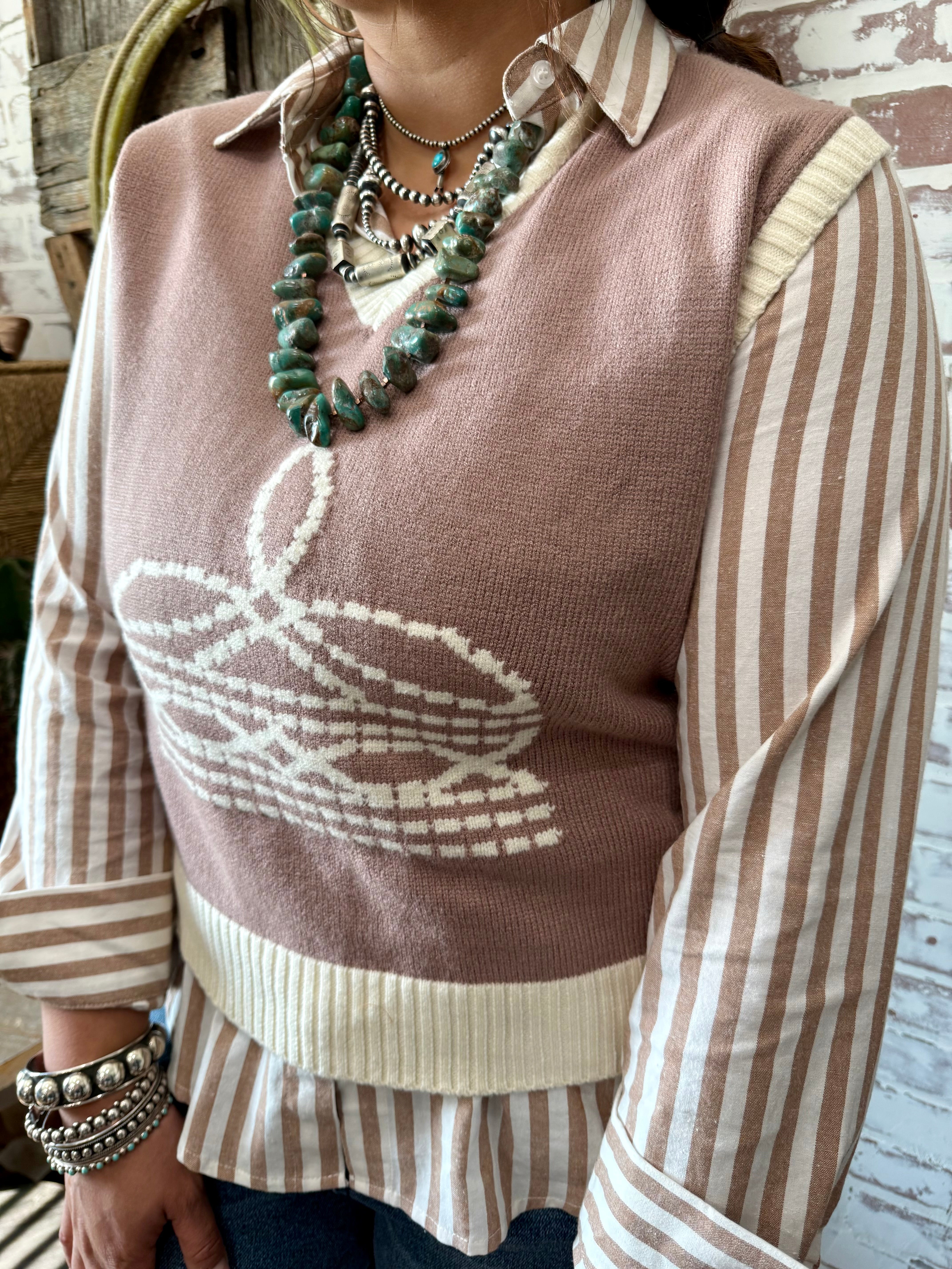 Turn heads with this Western-inspired crown knit sweater vest. Featuring a soft neutral tone, ivory trim, and bold crown motif, it’s the perfect punchy layer for rodeo nights, casual cowgirl outfits, and trend-setting Western fashion. Pair it with denim and boots for a true Barbwire n Bougie fashion statement!