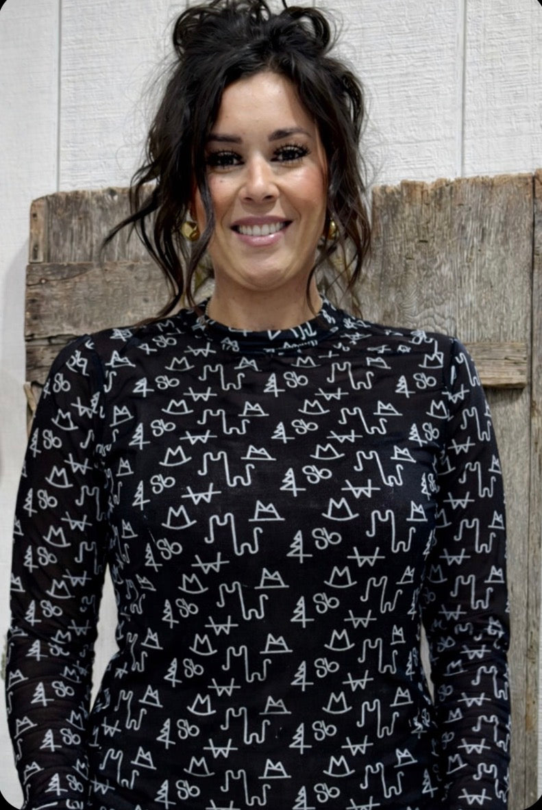 Make a statement in this black western cattle brand mesh mock neck top. Featuring an allover modern cowboy-inspired cattle brands this fitted long sleeve top is lightweight, stretchy, and perfect for layering. Style it under jackets, vests, or wear it solo for an edgy western-chic look. A must-have piece for year-round styling at Barbwire n Bougie