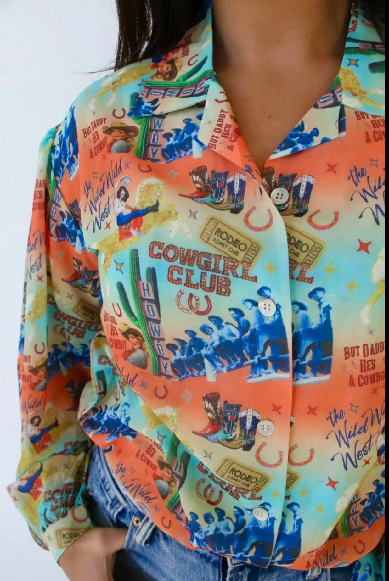 Wild West Cowgirl Club Collage Retro Print Button Down Top