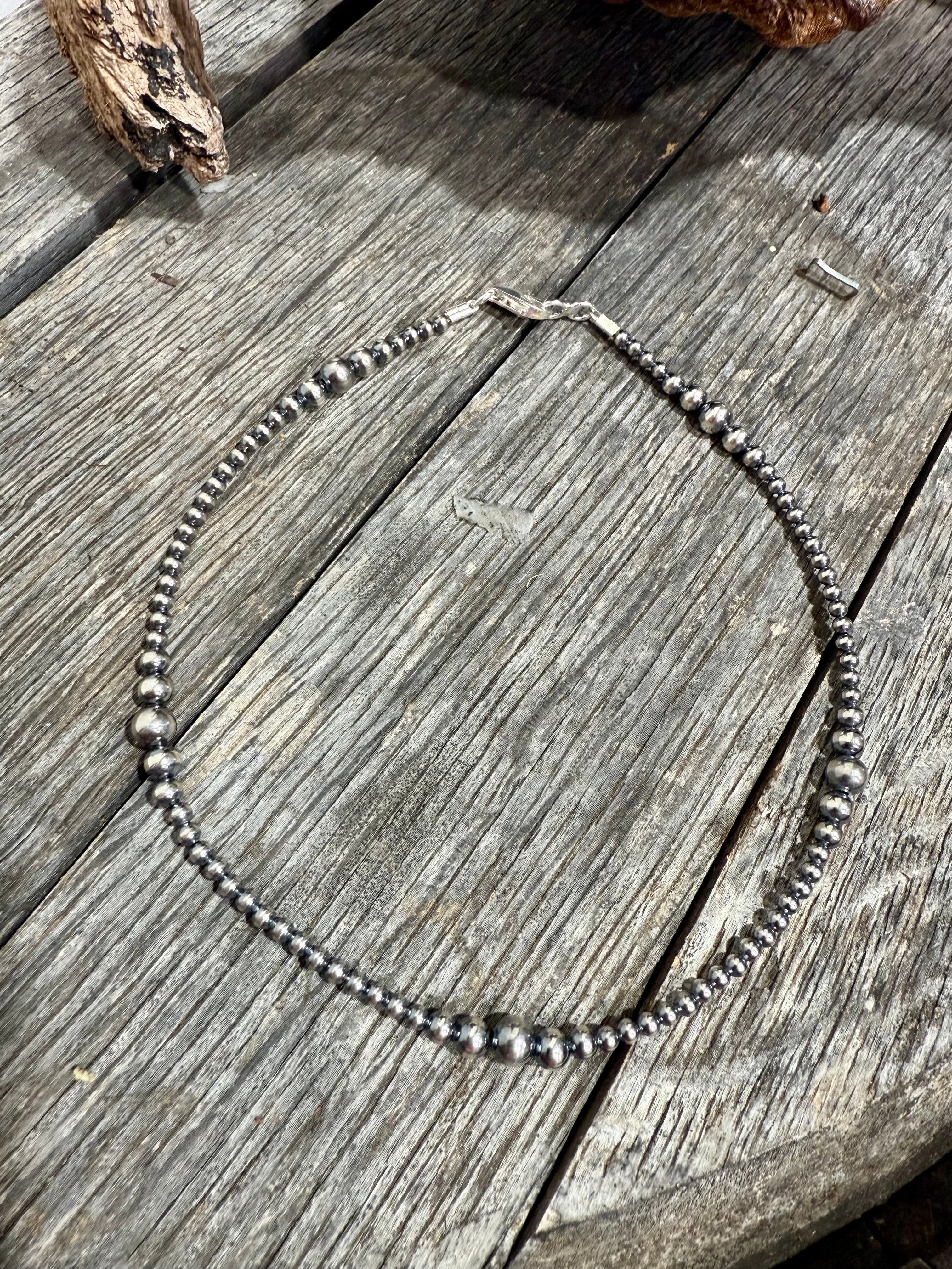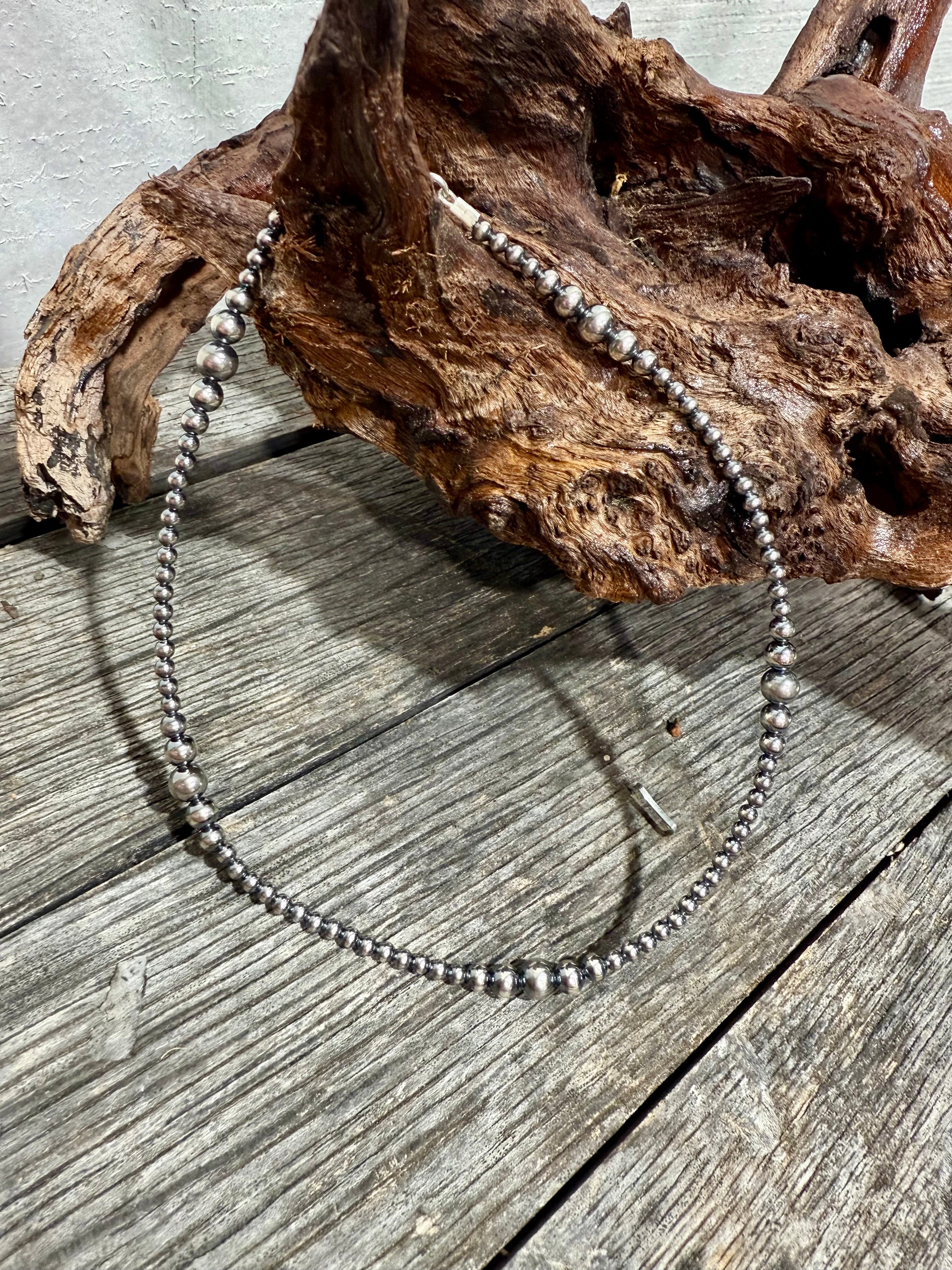 Elevate your everyday western style with this stunning 14” Graduated Sterling Silver Pearl Choker. Crafted with smooth 3–6mm sterling silver beads, this timeless piece features a classic Navajo-style graduated design that lays beautifully at the neckline. Perfect for layering with squash blossoms, turquoise pendants, or wearing solo for a chic, minimalist western look. A must-have staple for any cowgirl jewelry collection.