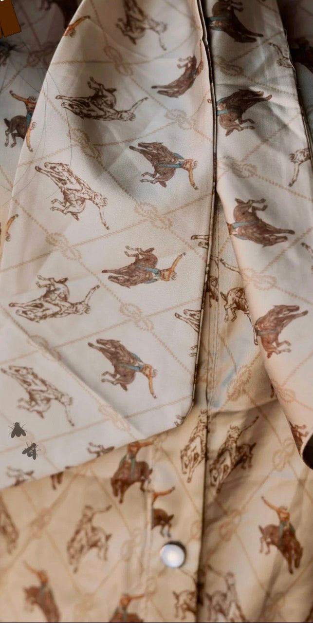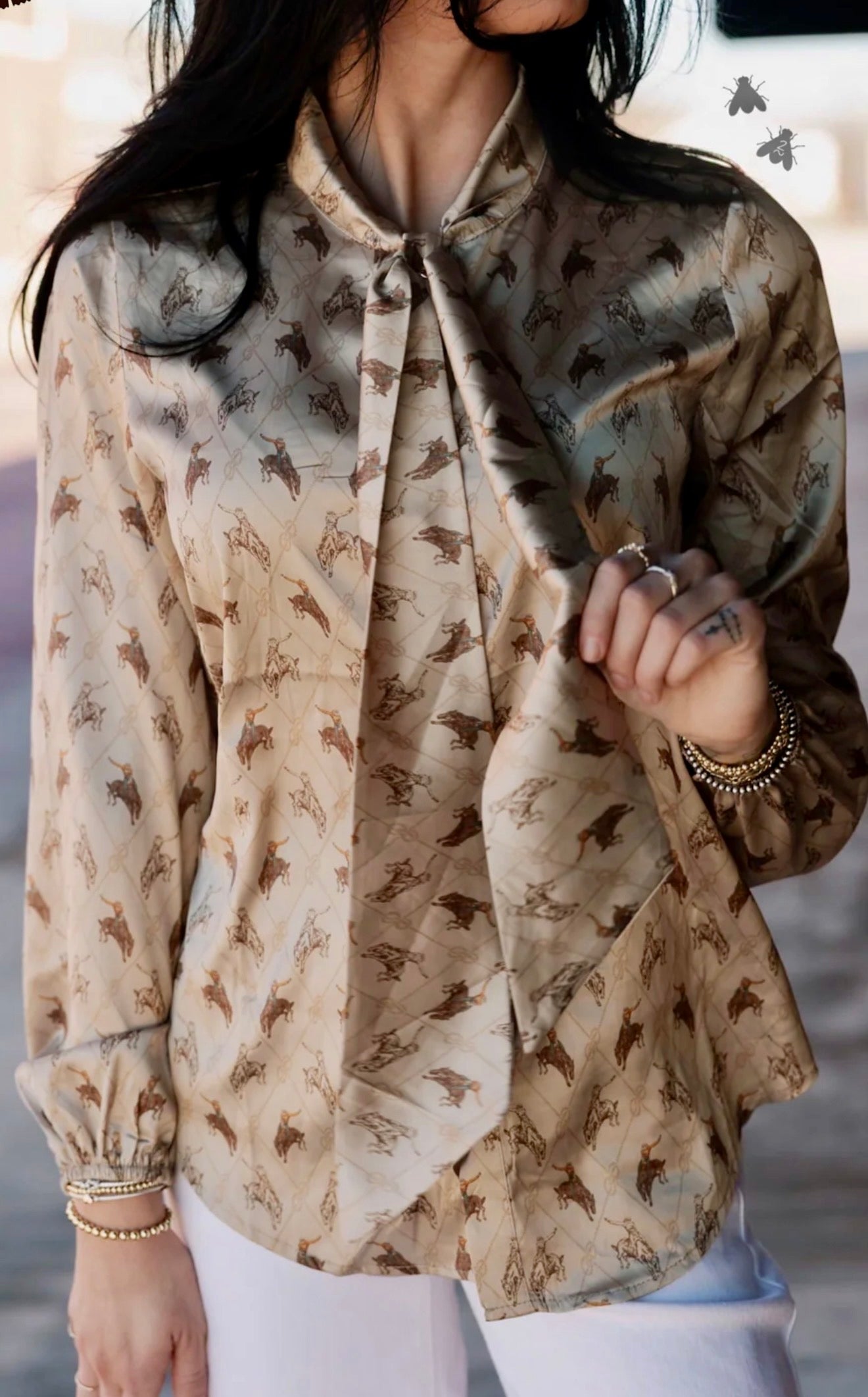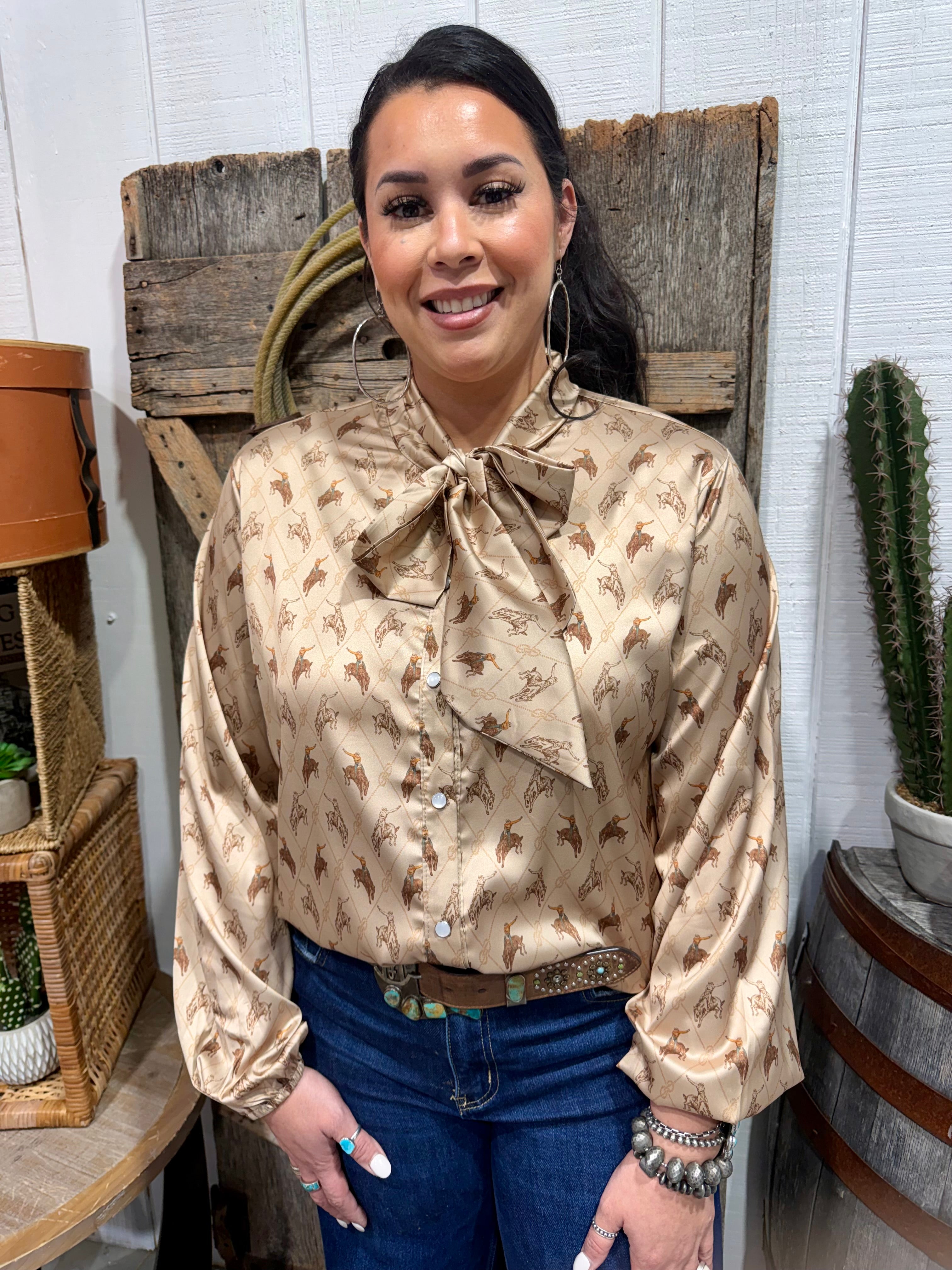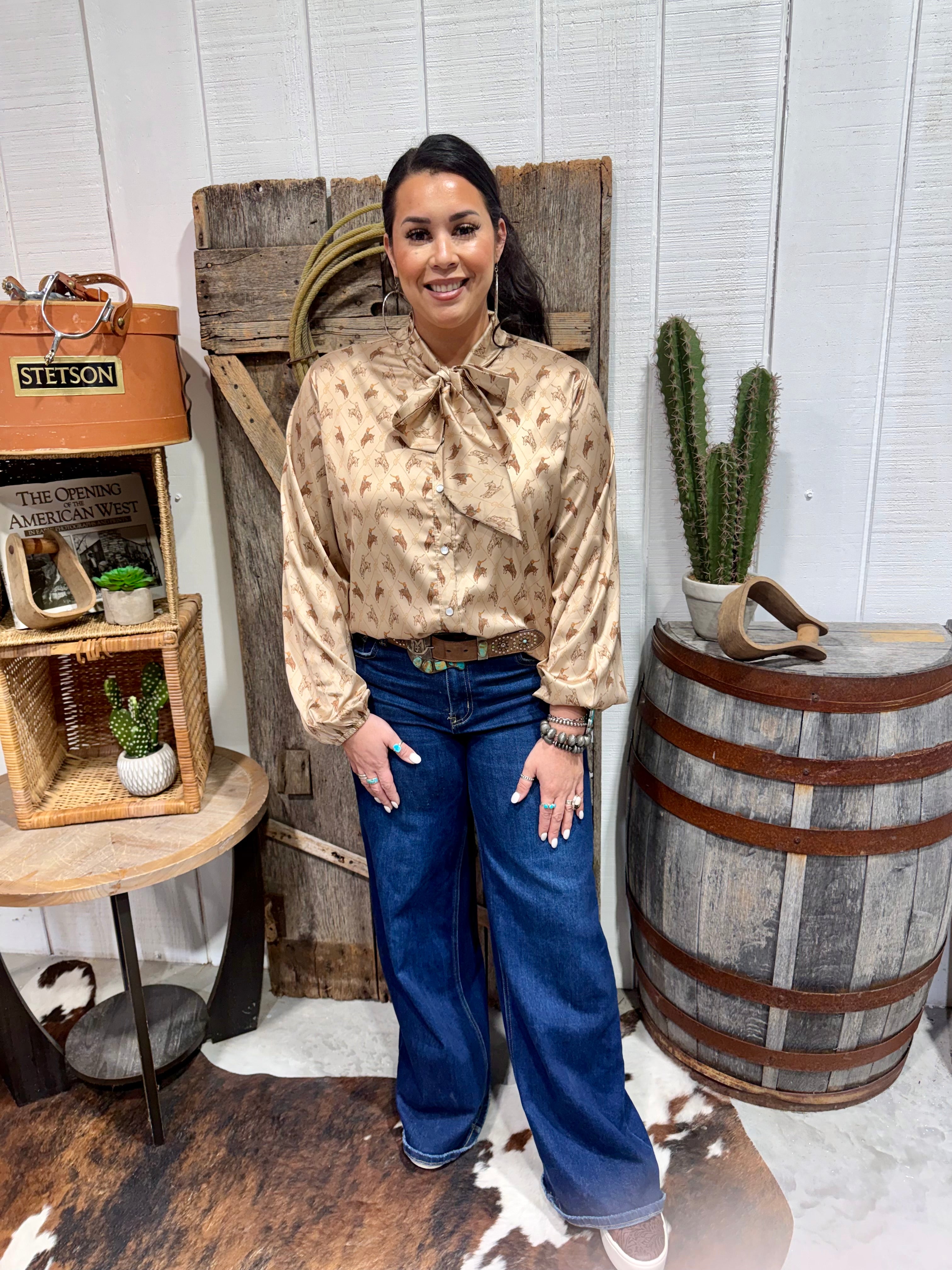 Make a bold western statement in the Brimstone Top by 2 Fly Co. This silky, lightweight blouse features an allover bucking horse print on a warm neutral backdrop with a classic tie-neck bow that can be worn loose or styled for a polished cowgirl look. The relaxed fit, button front, and soft drape give it an effortlessly elevated feel that pairs perfectly with denim, trousers, or layered under your favorite jacket. From the ranch to town, this top brings vintage western charm with modern boutique style.