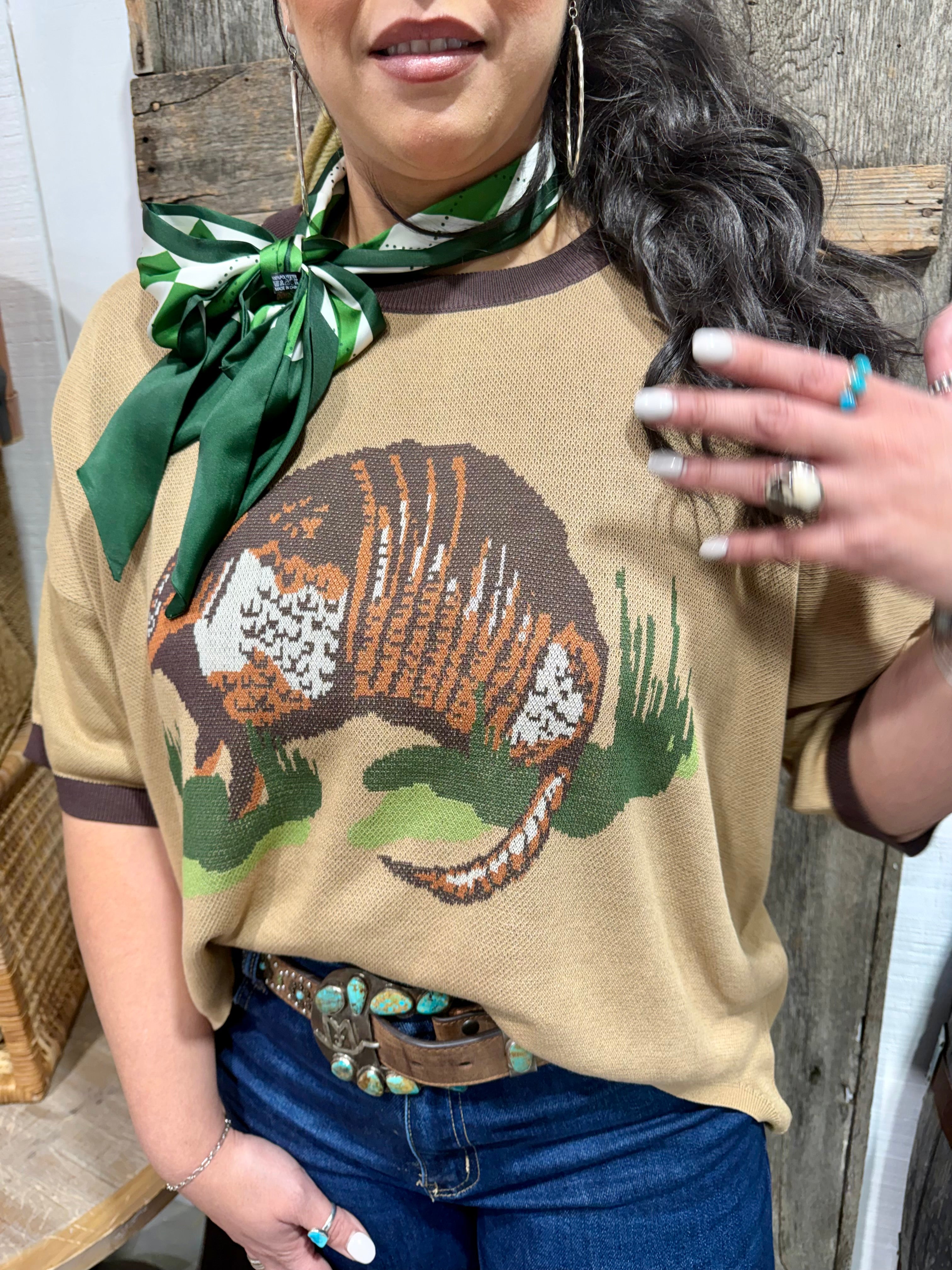 Featuring a bold retro armadillo knit graphic across the front, this lightweight sweater brings desert vibes, ranch character, and boutique style together in one effortless piece. The soft sand color with chocolate trim gives it that perfectly faded, sun-baked southwest feel that pairs beautifully with denim, turquoise, and boots.