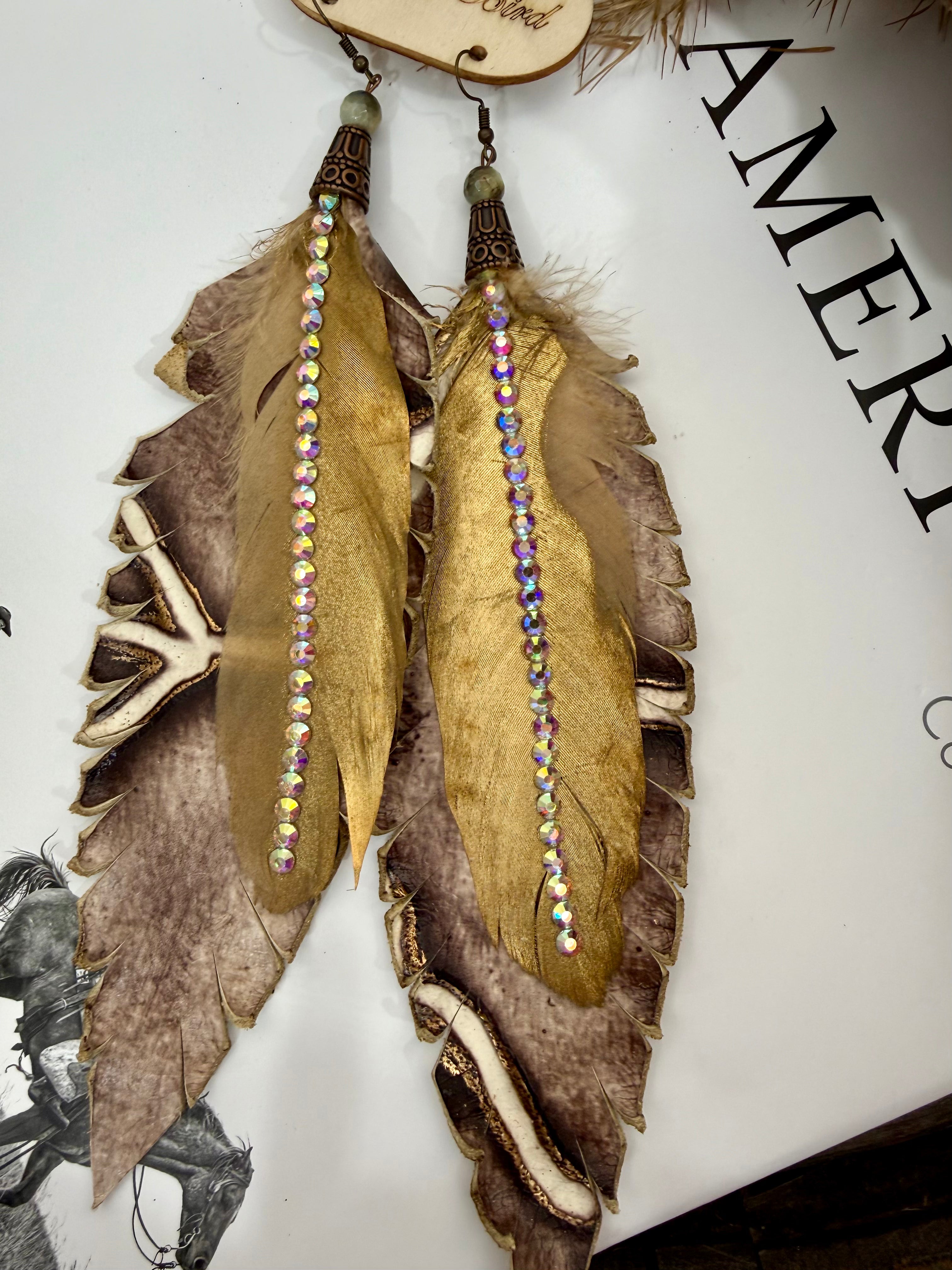 Make a statement with these A Rare Bird leather feather earrings that bring bold western boho energy to any outfit. Crafted from layered genuine leather feathers in rich earthy tones, each earring is finished with a vertical line of iridescent crystal accents that catch the light with every movement.