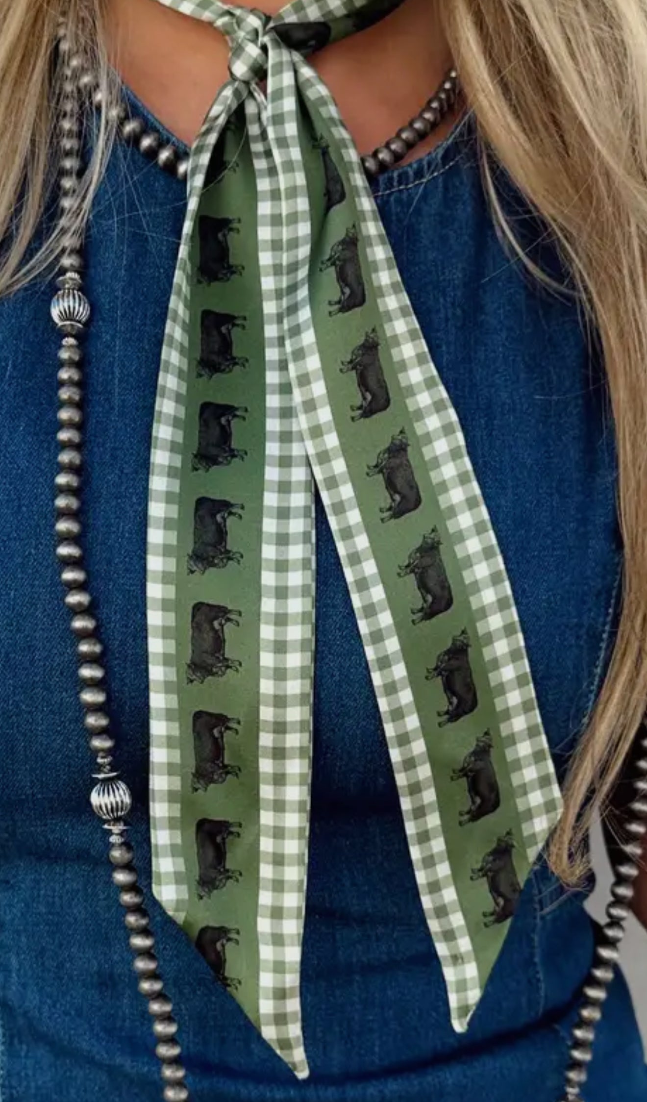 This chic Black Angus Twilly adds a punch of western charm to any outfit. Featuring a sage-green gingham print with bold black Angus cattle detailing, it’s the perfect accessory for cowgirls who love a touch of ranch-inspired flair. Style it as a necktie, hat band, or bag accent for a classy yet rustic look that complements denim, turquoise jewelry, and all your boutique favorites.