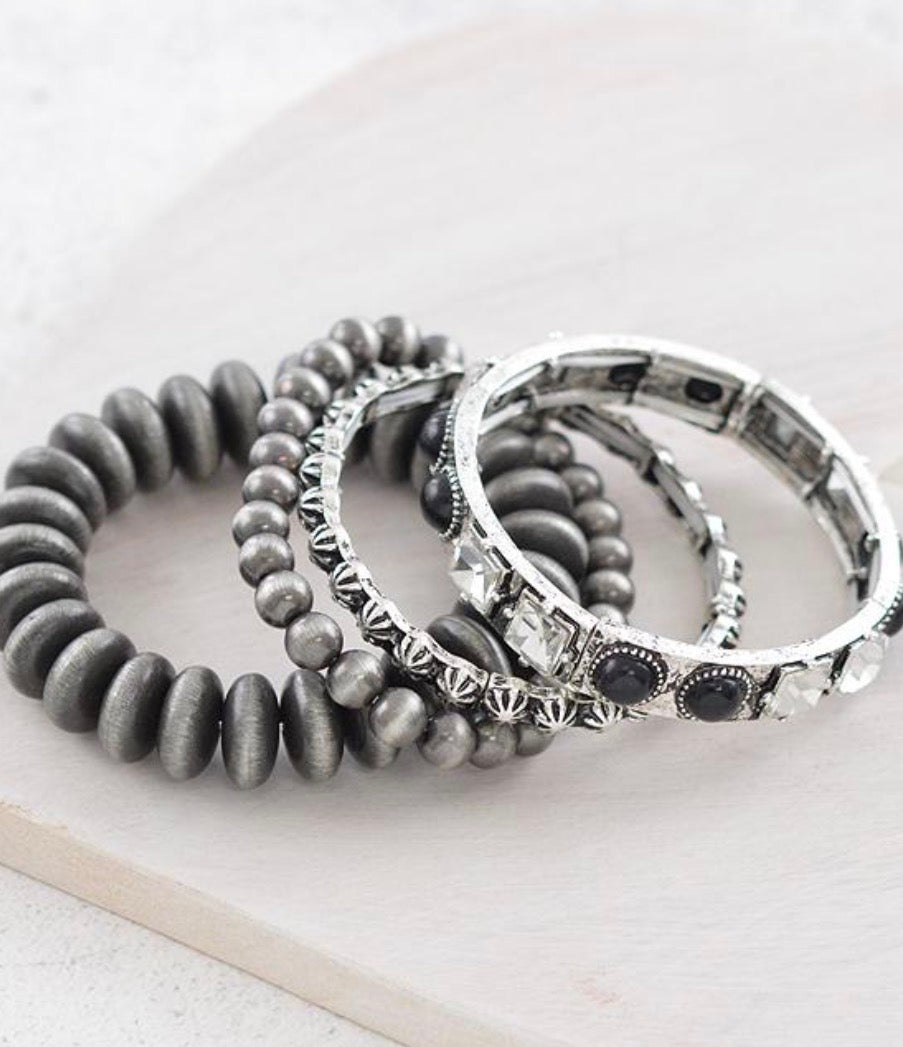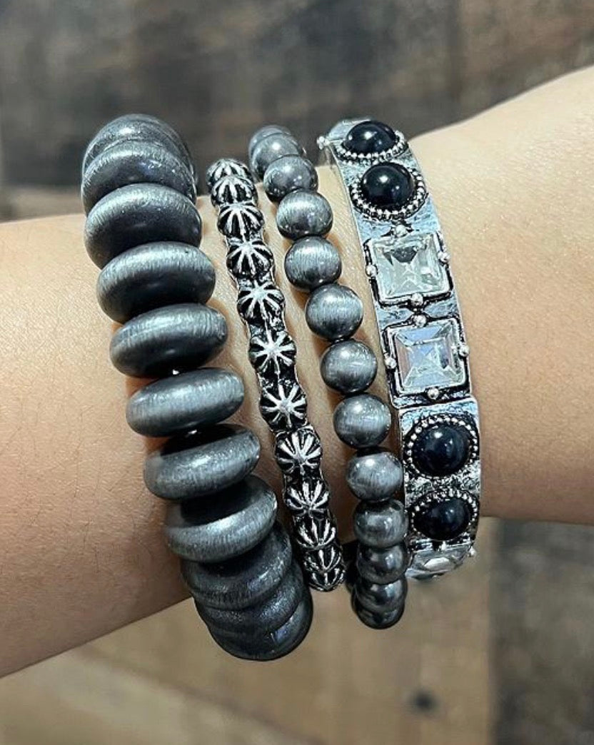 The deep black stones paired with oxidized silver tones create a striking contrast that layers beautifully with your everyday western jewelry. Each bracelet is stretch for an easy, comfortable fit and can be worn as a full stack or mixed into your favorite arm candy for a custom look.