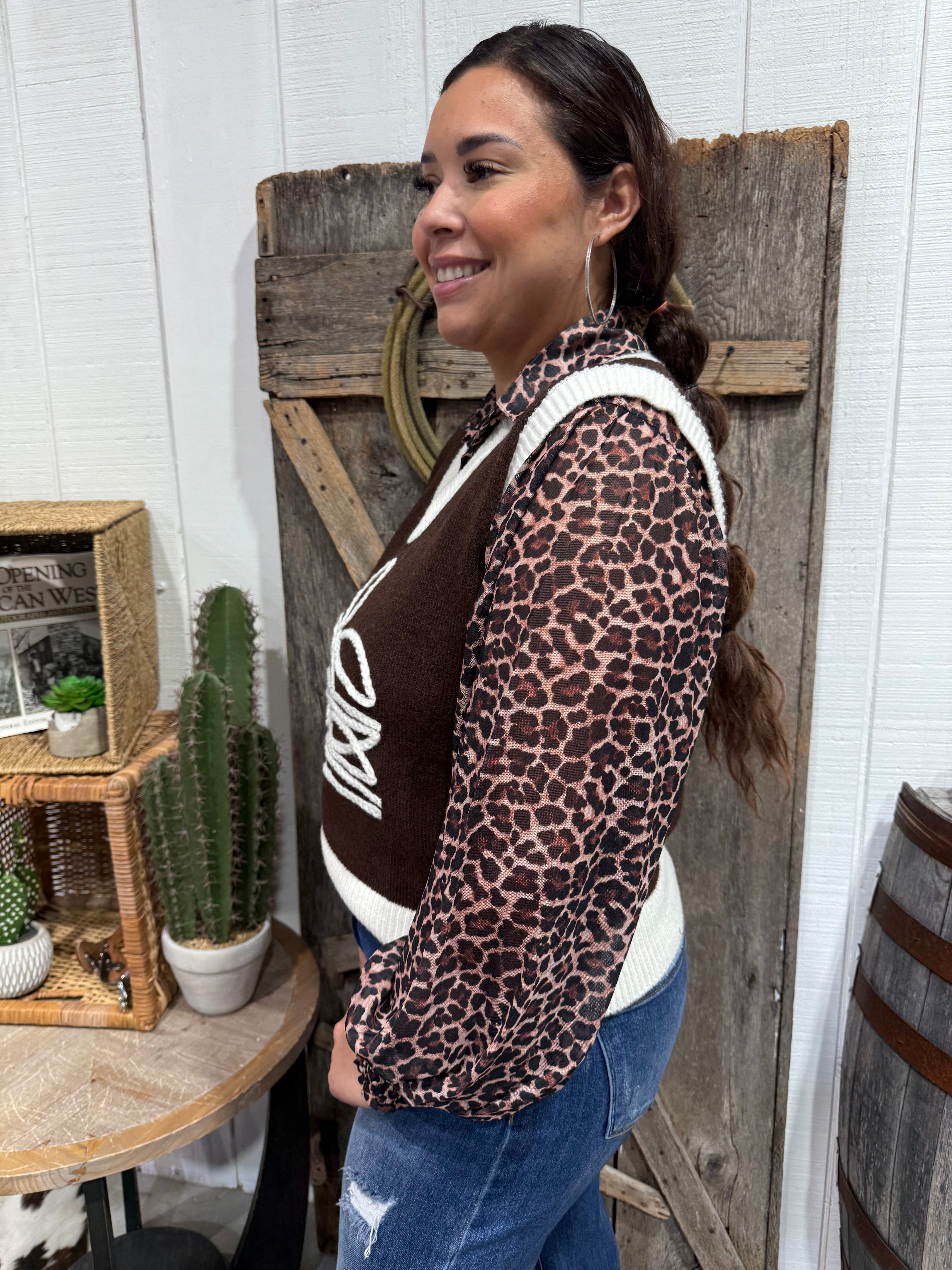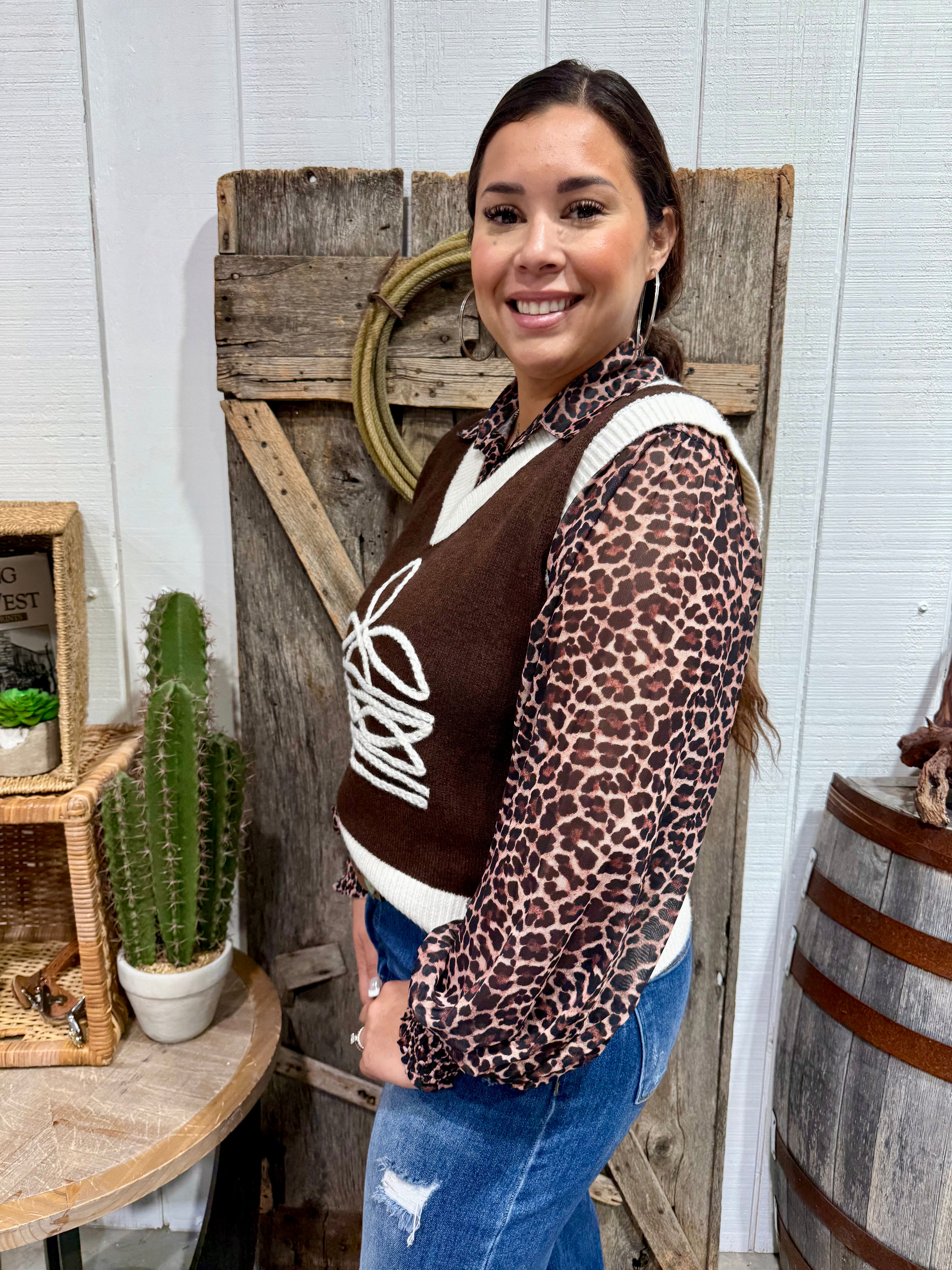 Saddle-up style meets cozy fall vibes! Our Brown Rope Graphic Western Sweater Vest brings that ranch-ready charm with a soft knit feel and cream rope-inspired design across the front. Layer it over your favorite button-down, bodysuit, or tee for a timeless cowgirl look that transitions effortlessly from arena days to boutique brunch.