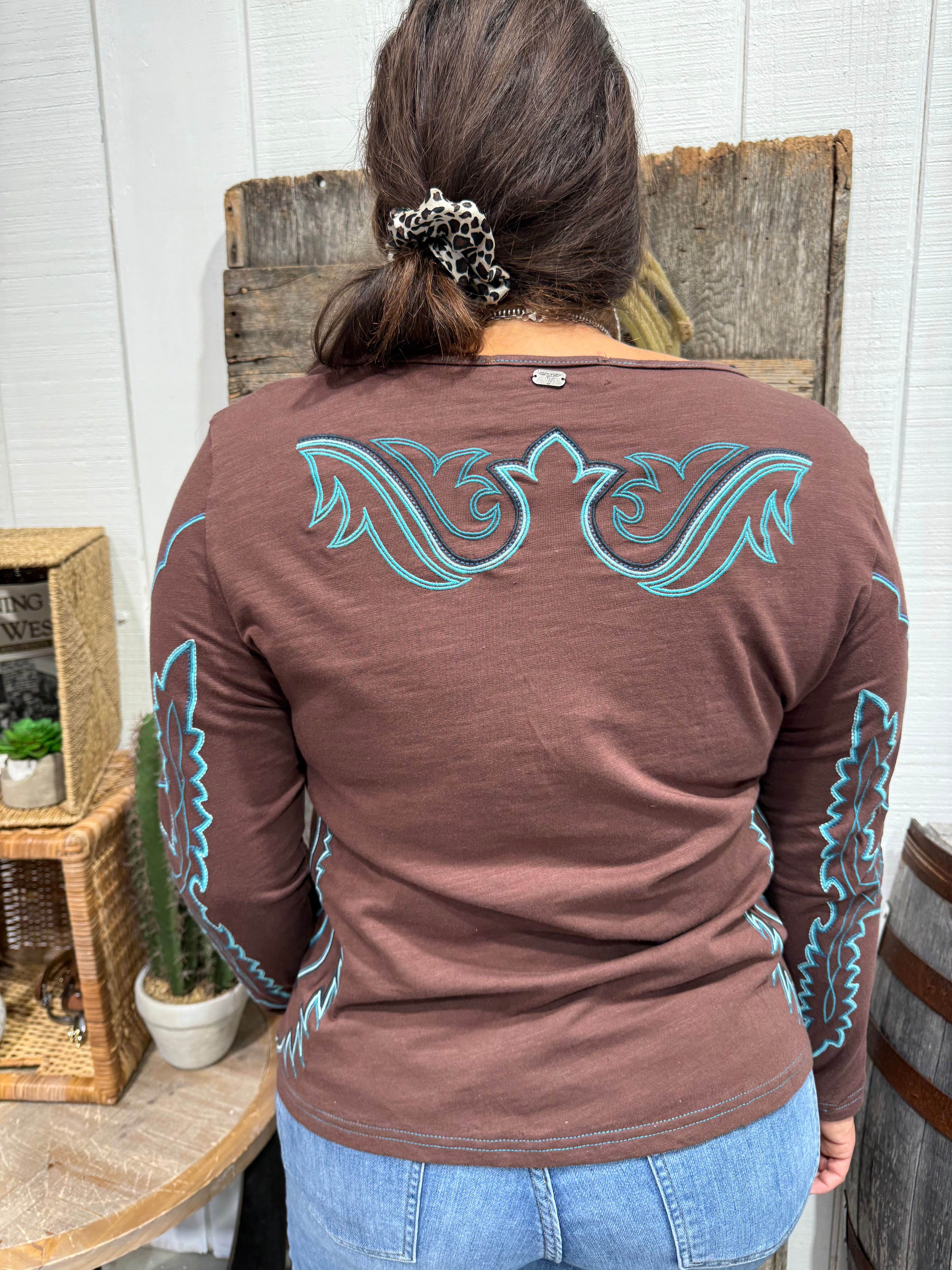 Turn heads in this western-chic long sleeve top featuring rich chocolate brown fabric and bold turquoise embroidery inspired by classic cowboy boot stitching. Designed with a flattering relaxed fit, lightweight stretch feel, and eye-catching boot-stitch details along the front, sleeves, and back – this is the perfect everyday cowgirl staple.