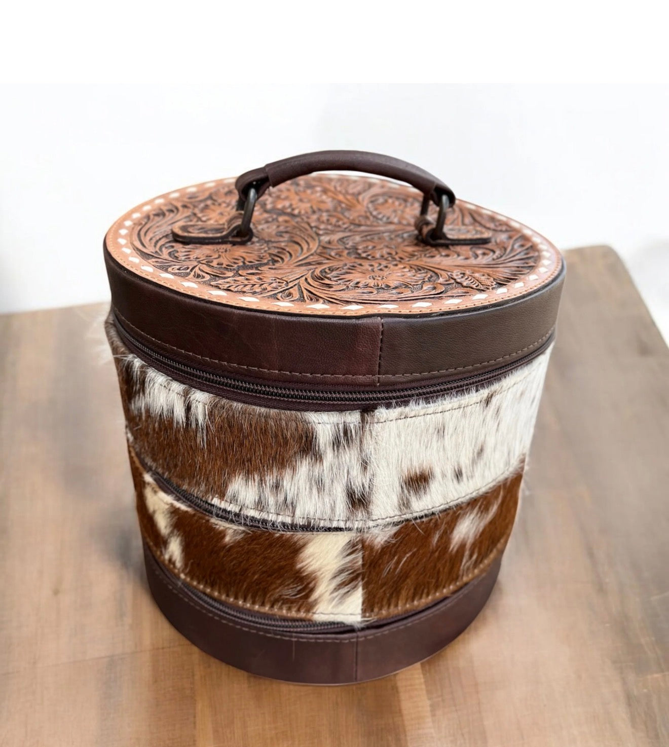 Made with genuine hair-on hide panels, buttery brown leather trim, and a beautifully detailed tooled-leather lid, this organizer brings ranch-raised charm to your vanity, suitcase, or trailer.