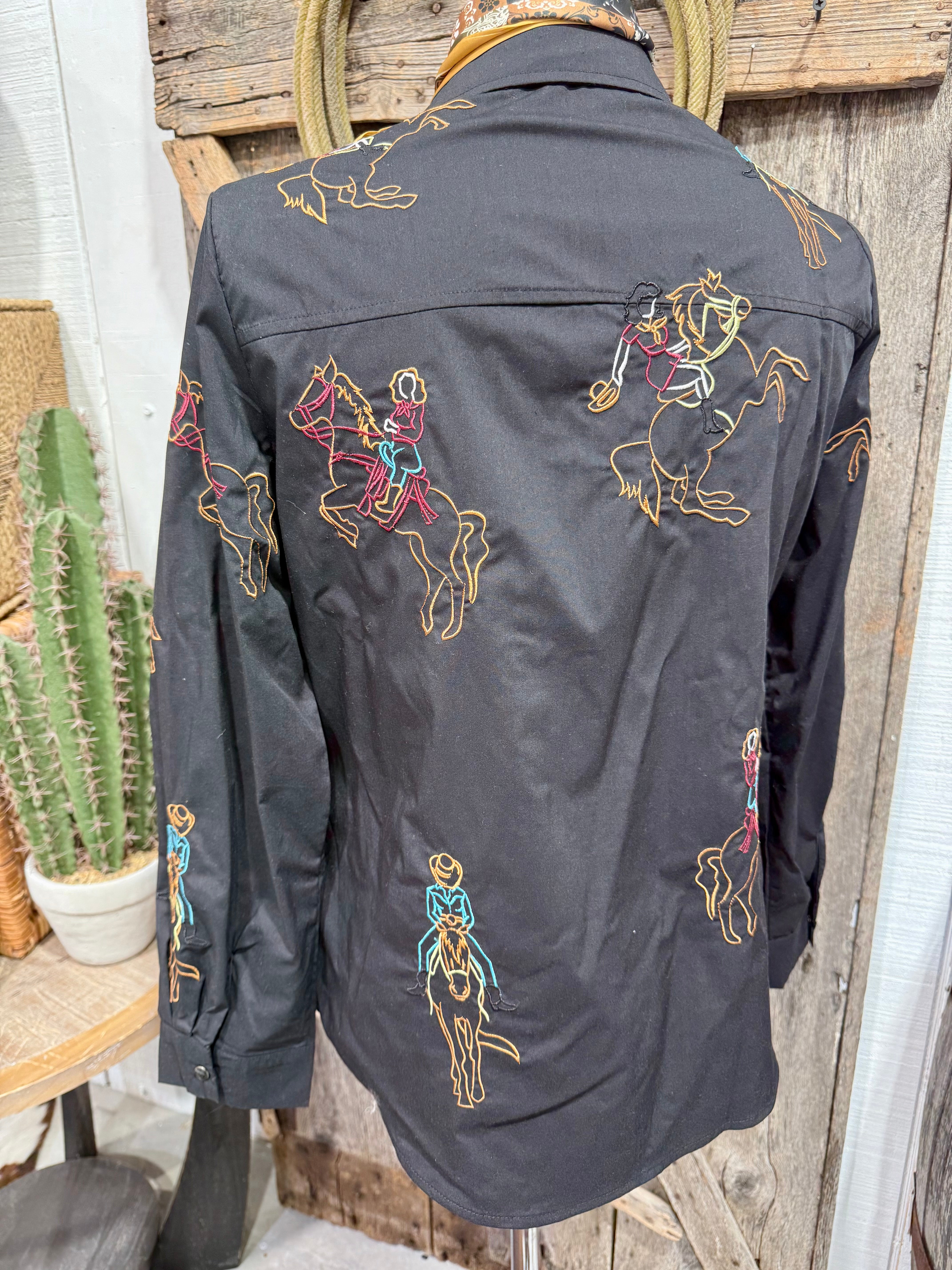 Turn heads from the ranch to the rodeo in this Embroidered Cowgirl Rodeo Button-Down Shirt. This black western blouse features colorful stitched bronc-riding cowgirls throughout — giving it a bold, vintage rodeo vibe that’s classy, feminine, and undeniably western.