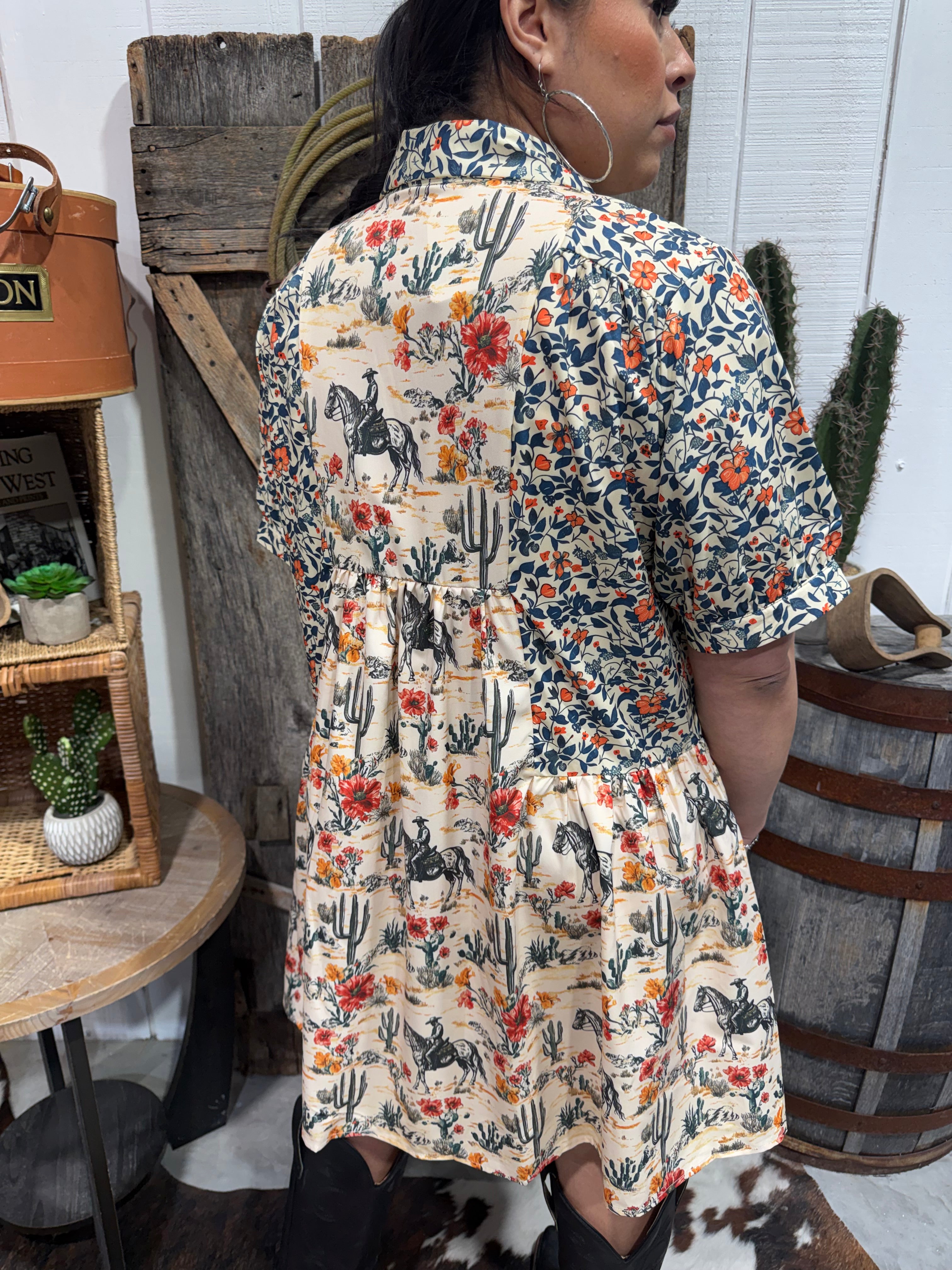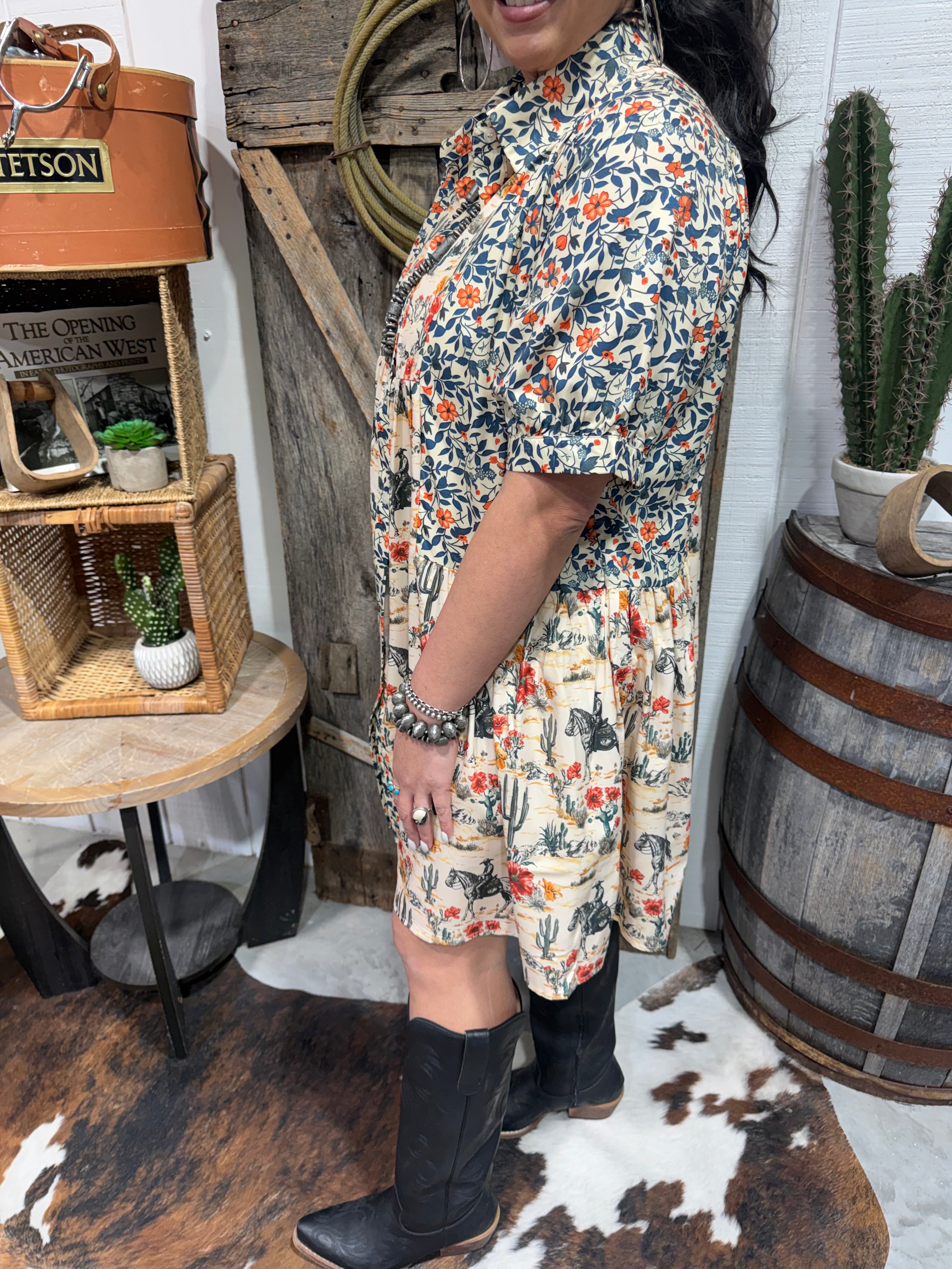 This floral cowboy print shirt dress is the perfect mix of soft feminine florals and bold western charm. Featuring an all-over print of horses, cactus, desert scenes, and warm rust florals, this button-down collared dress is an effortless statement piece you can throw on and go.