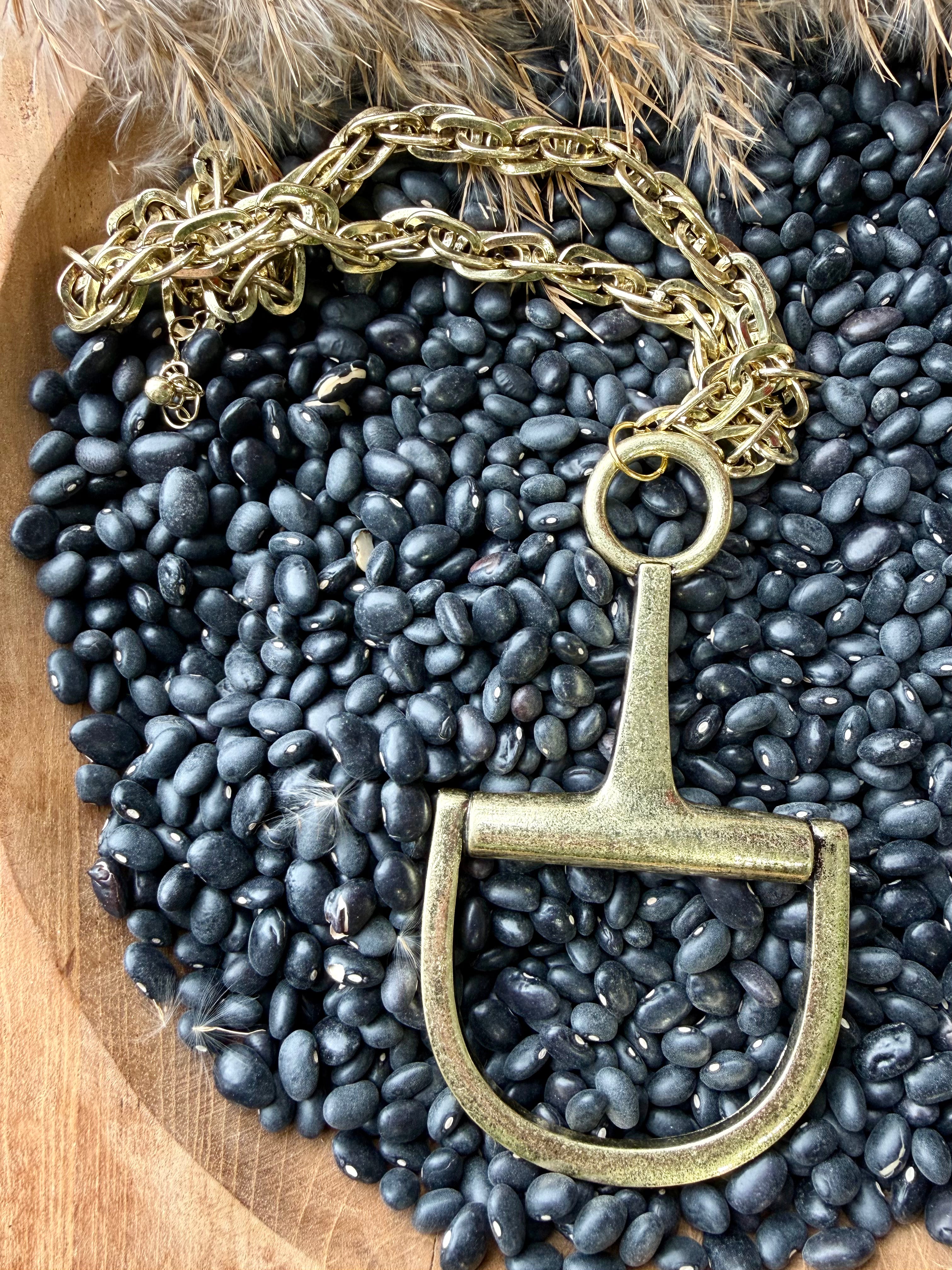 This oversized gold snaffle bit necklace is the ultimate statement piece for rodeo nights, stock show season, or everyday ranch glam. Featuring a chunky gold chain and large vintage-inspired bit pendant, it brings that classic equestrian vibe with a modern western twist.