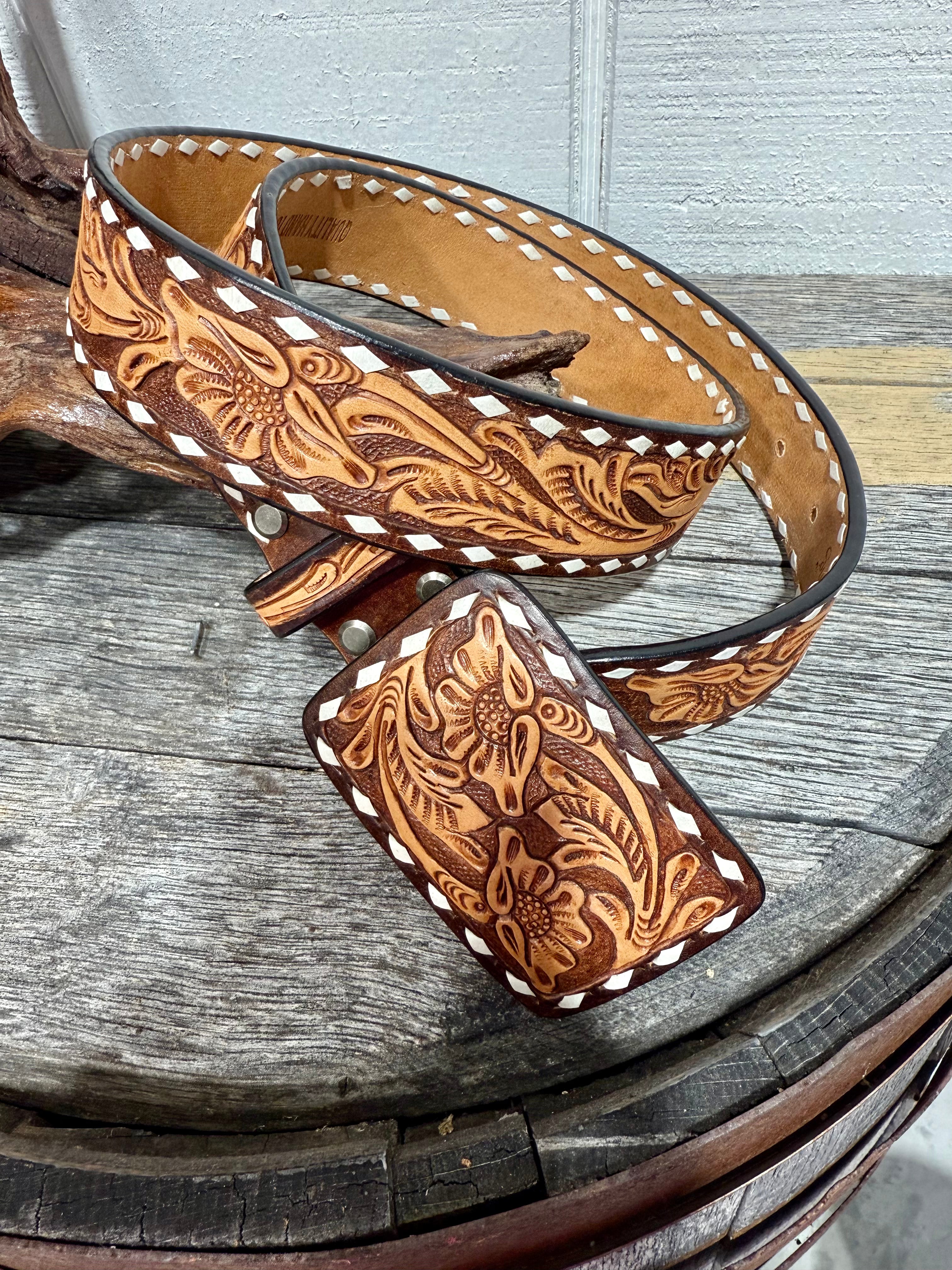 Turn heads with this stunning hand-tooled western leather belt featuring intricate floral carving and classic buck-stitch edges. Crafted from premium genuine leather, this belt showcases rich two-tone detailing and a bold engraved floral pattern that embodies true western craftsmanship. The removable matching tooled buckle adds versatility — perfect for pairing with jeans, skirts, or your favorite cowgirl boots.
