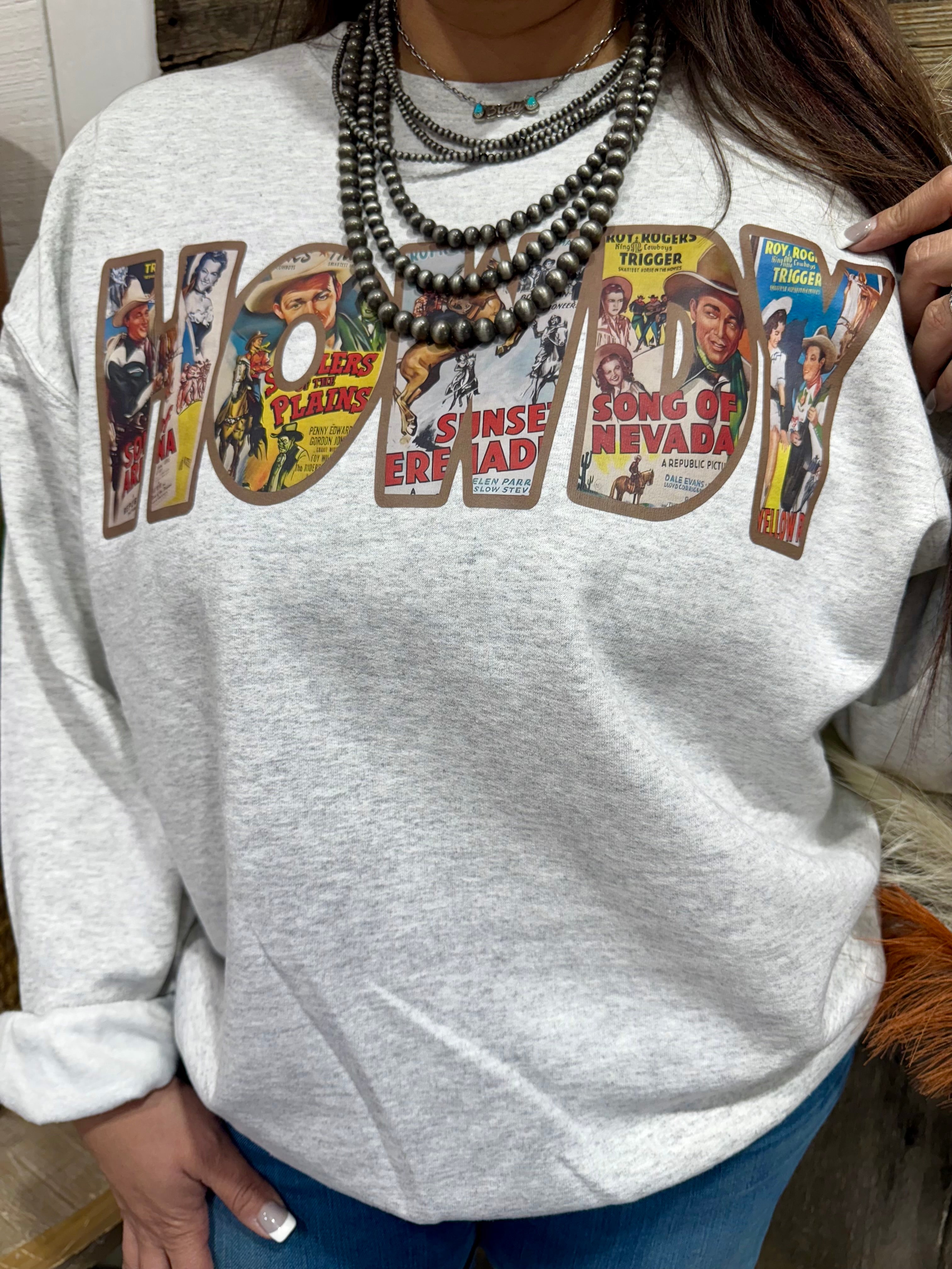 Say Howdy in true cowgirl style with this retro western sweatshirt! The bold block letters feature colorful vintage rodeo and cowboy movie posters — from Roy Rogers to classic “Song of Nevada” and “Riders of the Plains” prints. Crafted from soft heather gray fleece, this cozy pullover adds nostalgic western charm to any outfit. Perfect for pairing with your favorite turquoise jewelry, flare jeans, or boots for a laid-back punchy look.