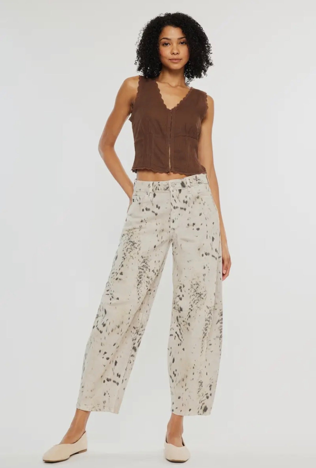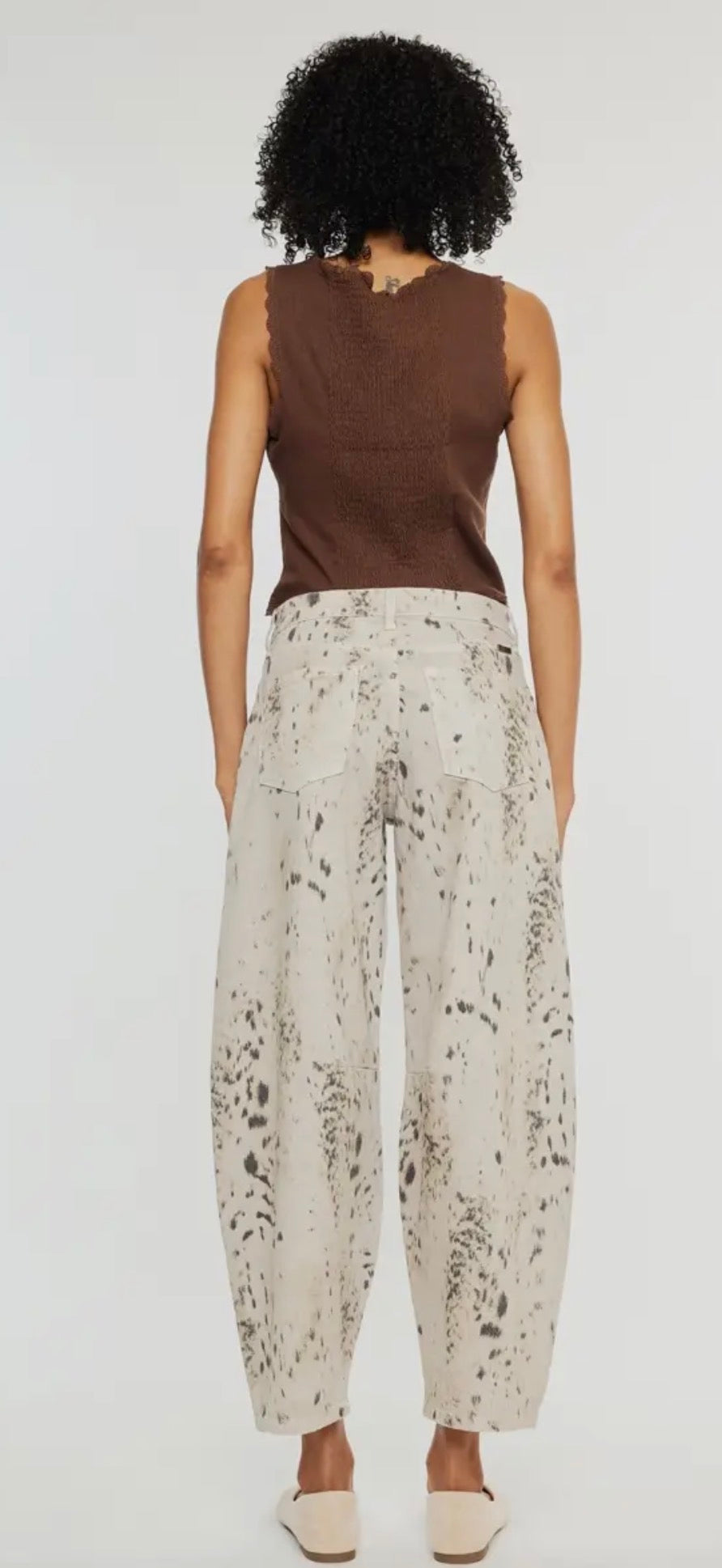 • Elevate your denim game with these high rise barrel jeans, featuring a unique brindle cowprint and dramatic silhouette.