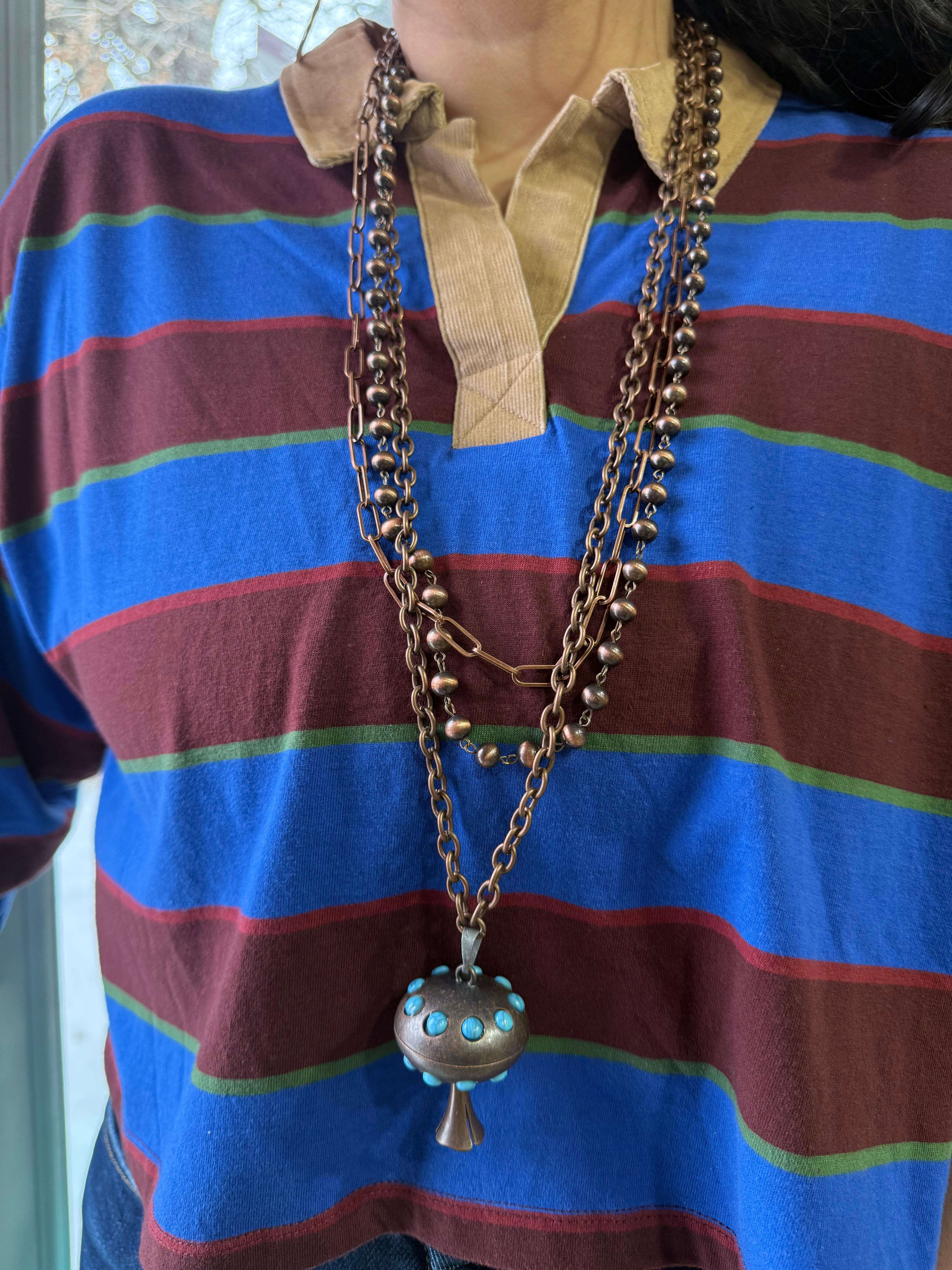 Bold. Layered. Unapologetically western. This layered Navajo pearl style is chain necklace features multiple strands of oxidized copper-tone chains paired with classic Navajo-style pearls and a striking turquoise-studded squash blossom pendant centerpiece.