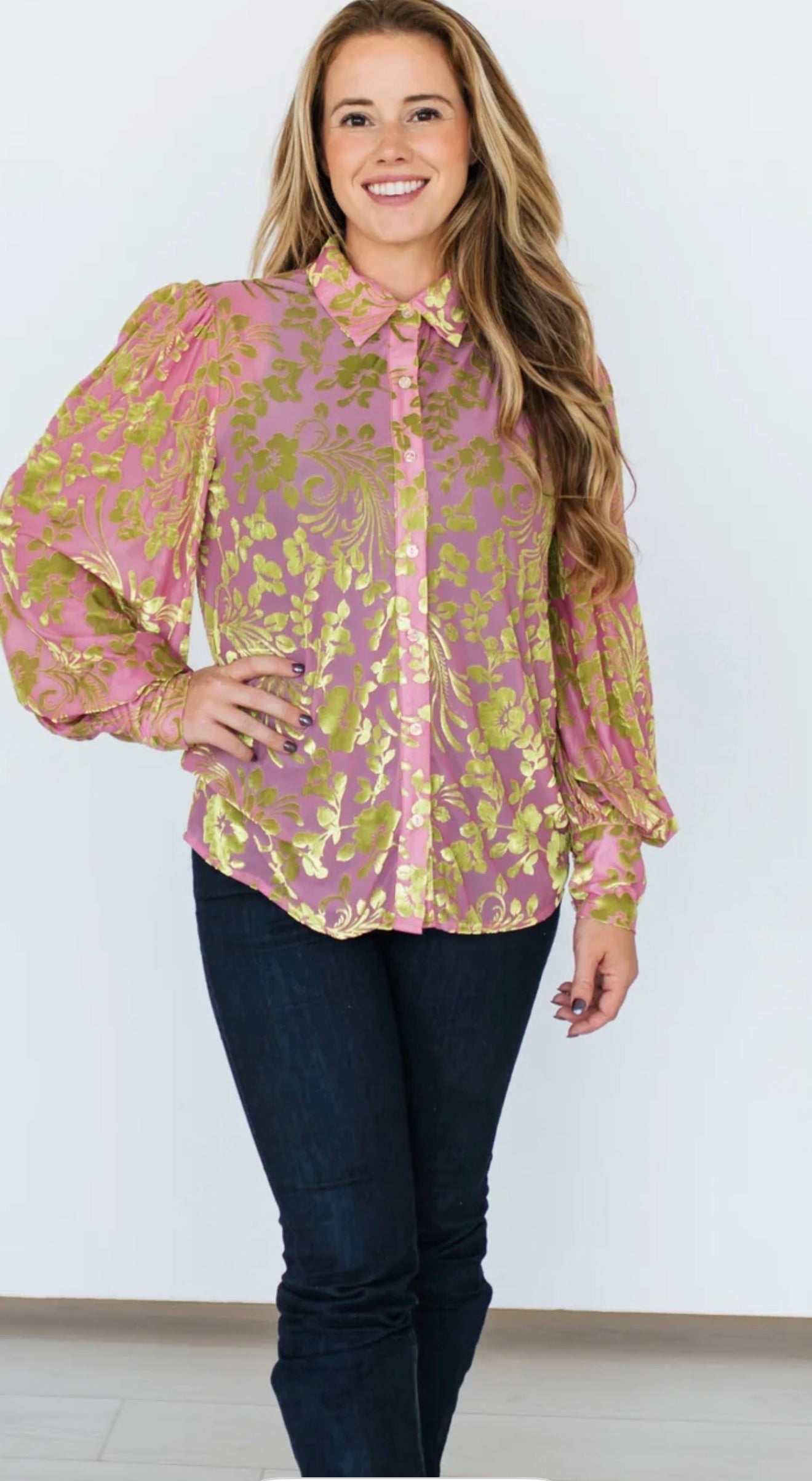 Turn heads in this stunning pink/lime Velvet Jacquard Floral Blouse, the perfect mix of western elegance and rich, dressy texture. This top features a velvety burnout floral design in warm mocha and chocolate tones that catch the light beautifully. With its soft drape, button-down front, and billowy sleeves with smocked cuffs, it moves effortlessly from rodeo date nights to holiday gatherings to work-to-weekend wear.