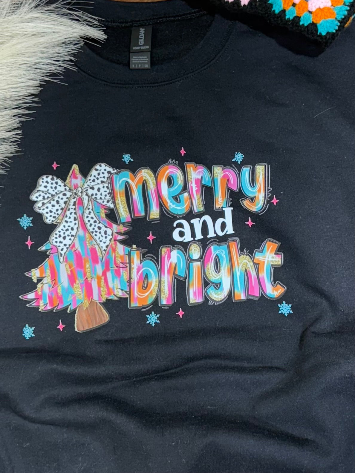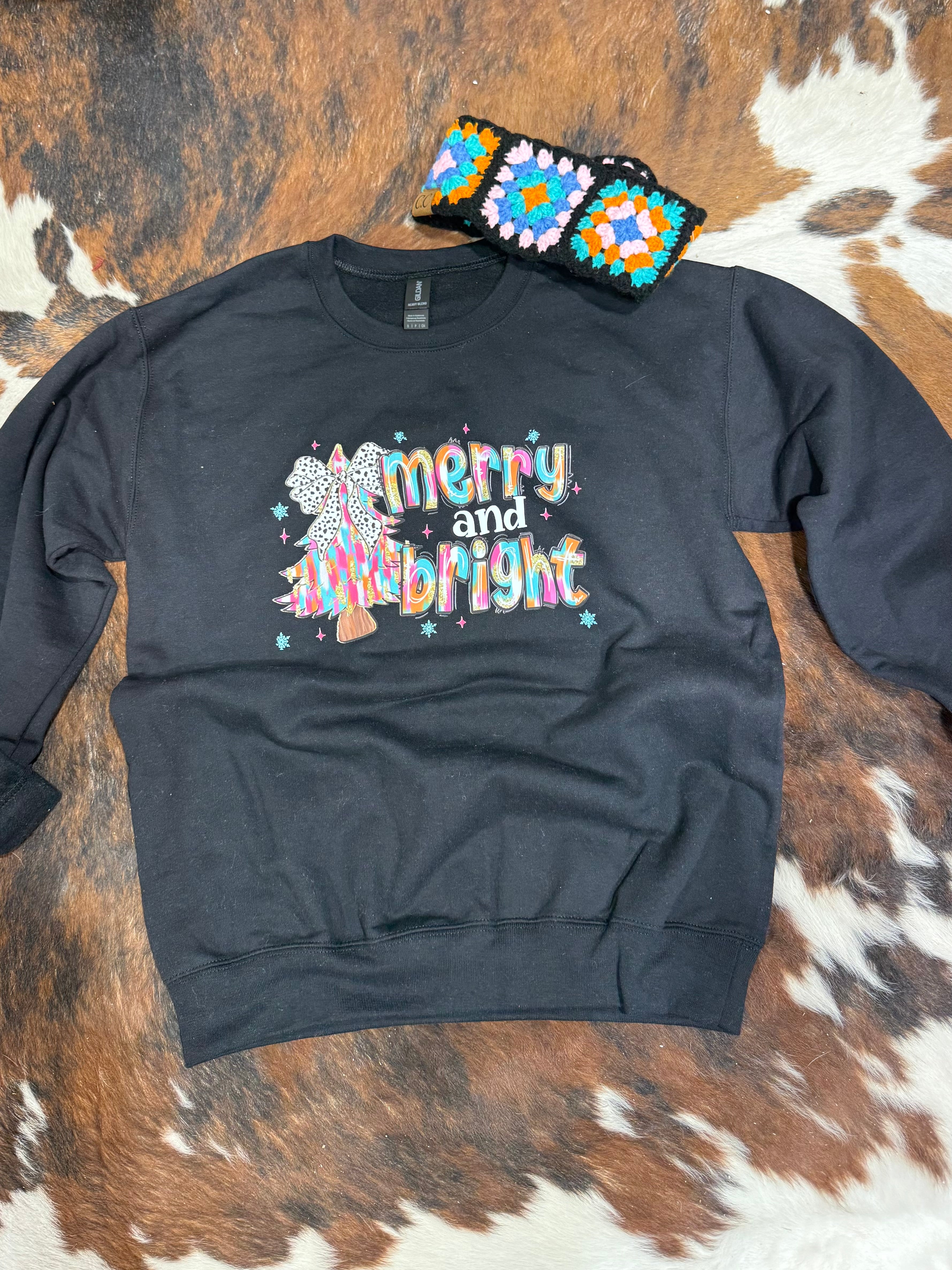 Bring all the festive fun with our Merry & Bright Christmas Sweatshirt ! This bold and colorful holiday graphic features a vibrant brushstroke Christmas tree topped with a playful black-and-white leopard bow, glitter-style accents, and cheerful “merry & bright” lettering. Perfect for cowgirls who love a little sass, sparkle, and southwest style during the holiday season.