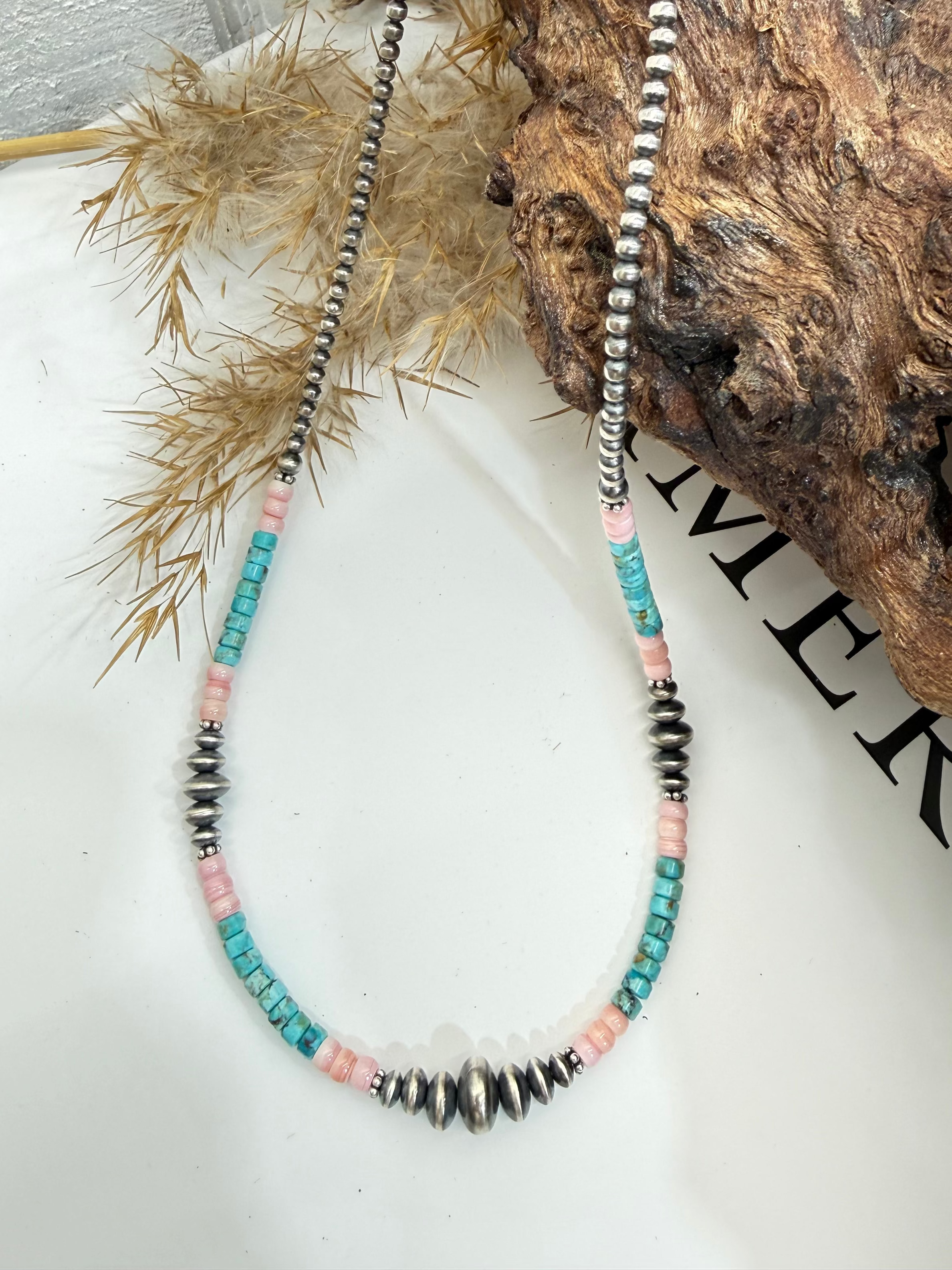 This western statement necklace pairs classic oxidized Navajo pearls with soft pink conch and vibrant turquoise heishi beads for a fresh pop of color. Sterling silver saucers at the center add texture and movement while keeping the look rooted in traditional southwestern style. Perfect for layering or wearing solo, this piece brings a playful cowgirl vibe to denim, graphics, and wild rags. A beautiful blend of timeless silver and colorful stone for everyday western wear.