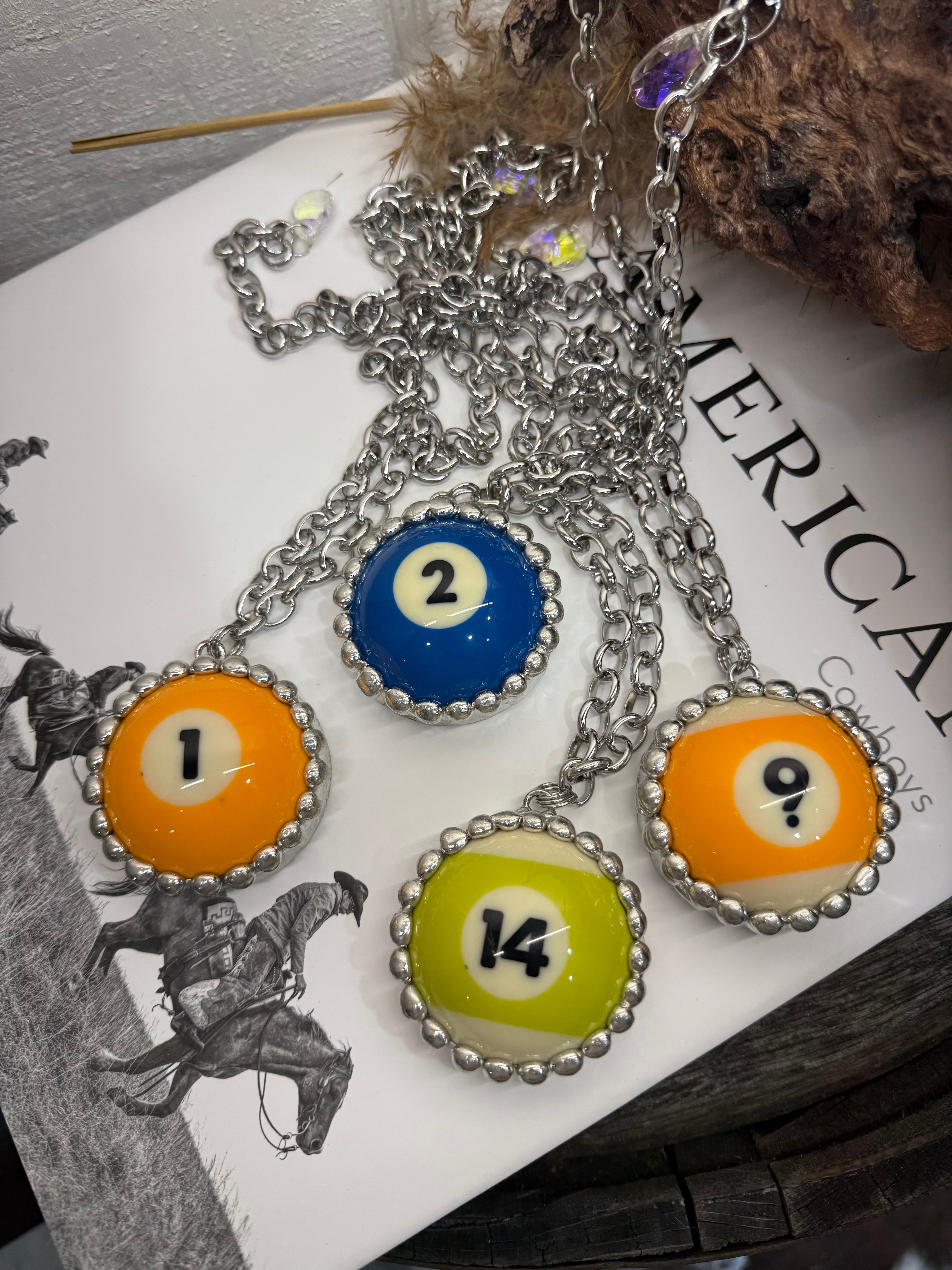 This bold western statement necklace features authentic pool ball charms set in a soldered beaded concho-style bezel and hung on chunky layered silver chains for the ultimate edgy cowgirl vibe. Each necklace showcases a classic billiards number ball, turning a vintage game hall icon into a head-turning piece of western fashion.