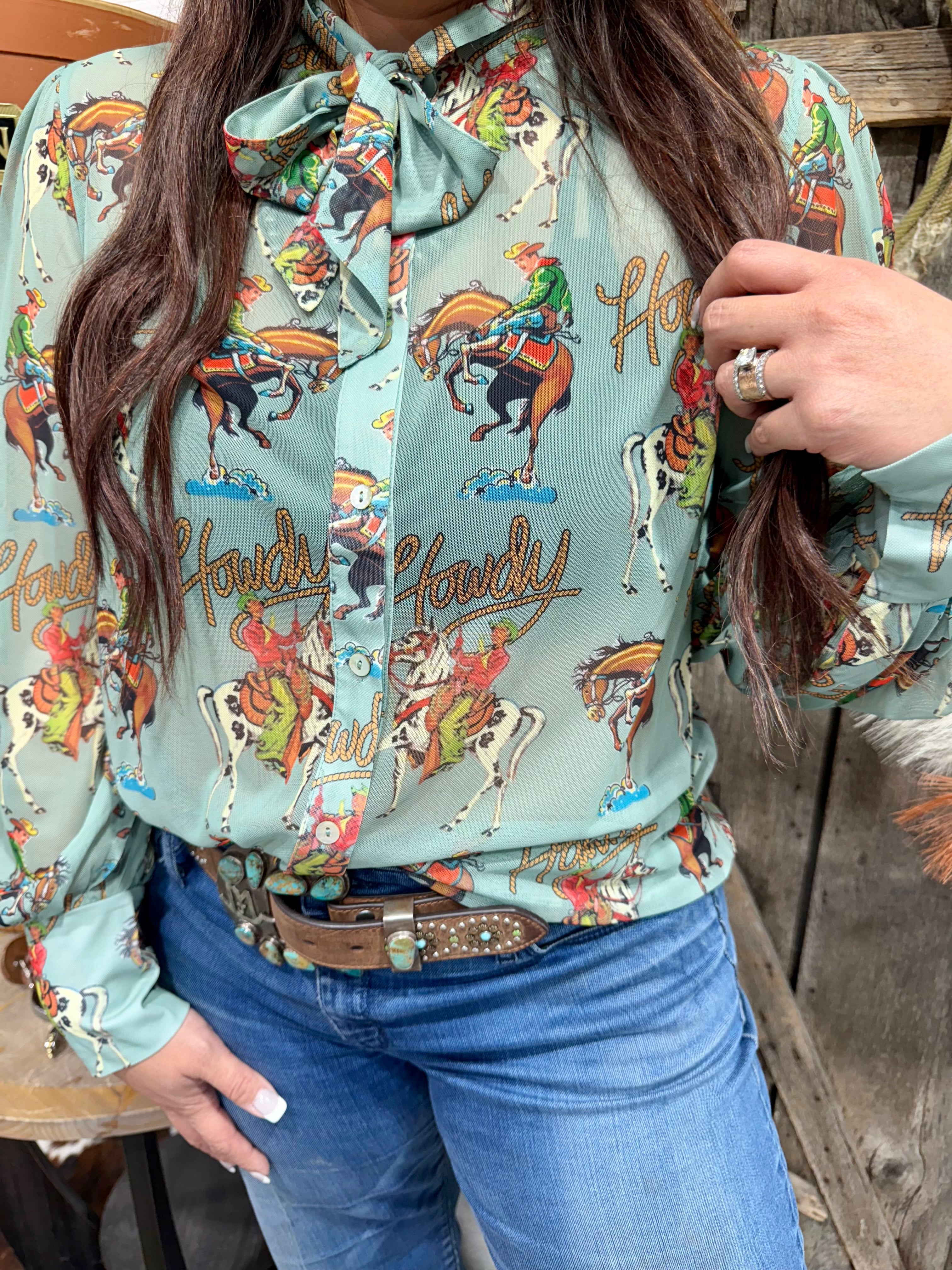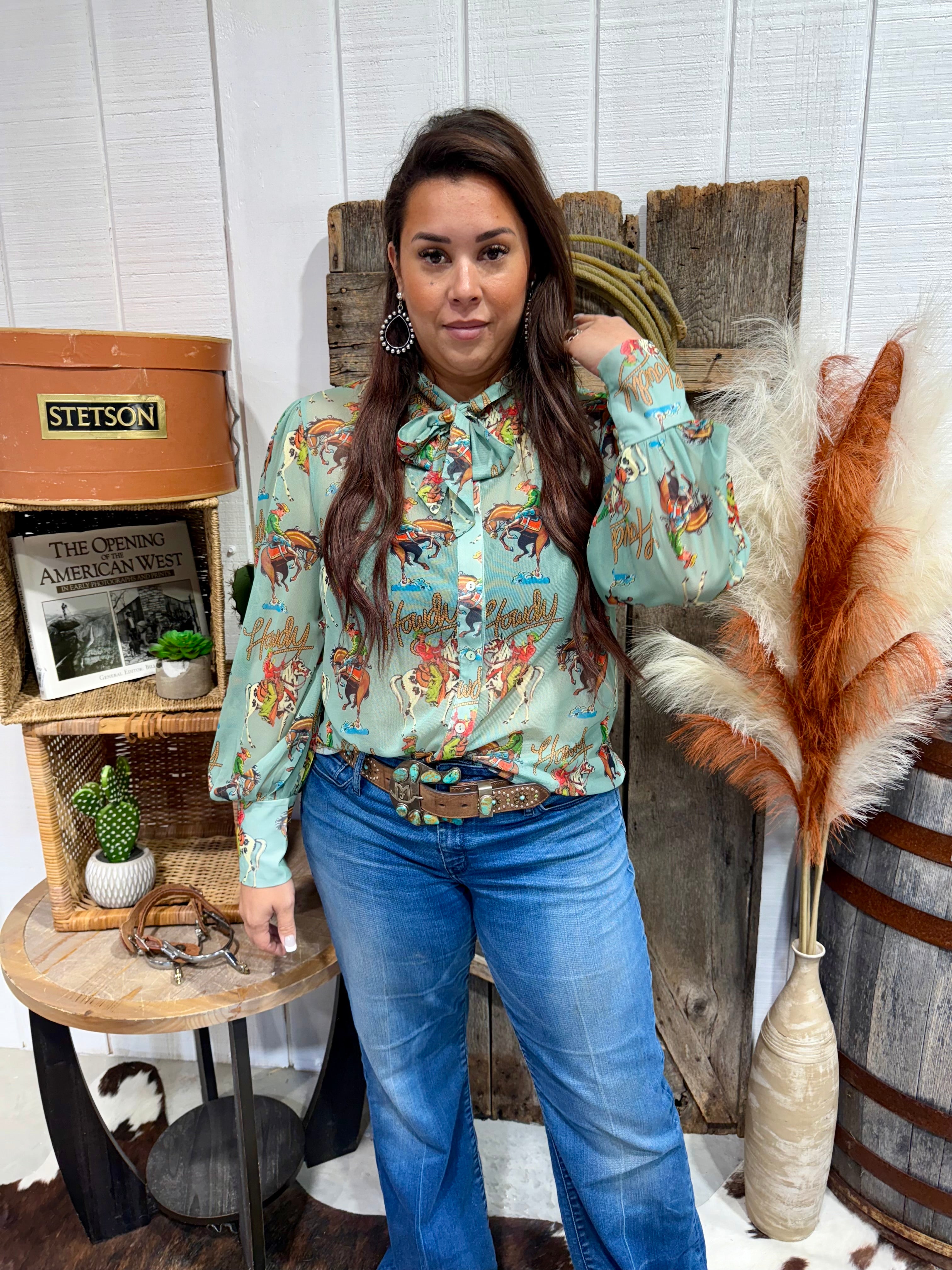 Say “Howdy” in style with this vintage-inspired western blouse! Featuring playful cowgirl and rodeo graphics on a soft sage background, this silky button-down is finished with a statement bow tie neckline and puff sleeves for a feminine yet bold look. Pair it with high-waisted denim or corduroy for a classic cowgirl vibe. Perfect for rodeos, photoshoots, or adding a dash of sass to everyday wear.