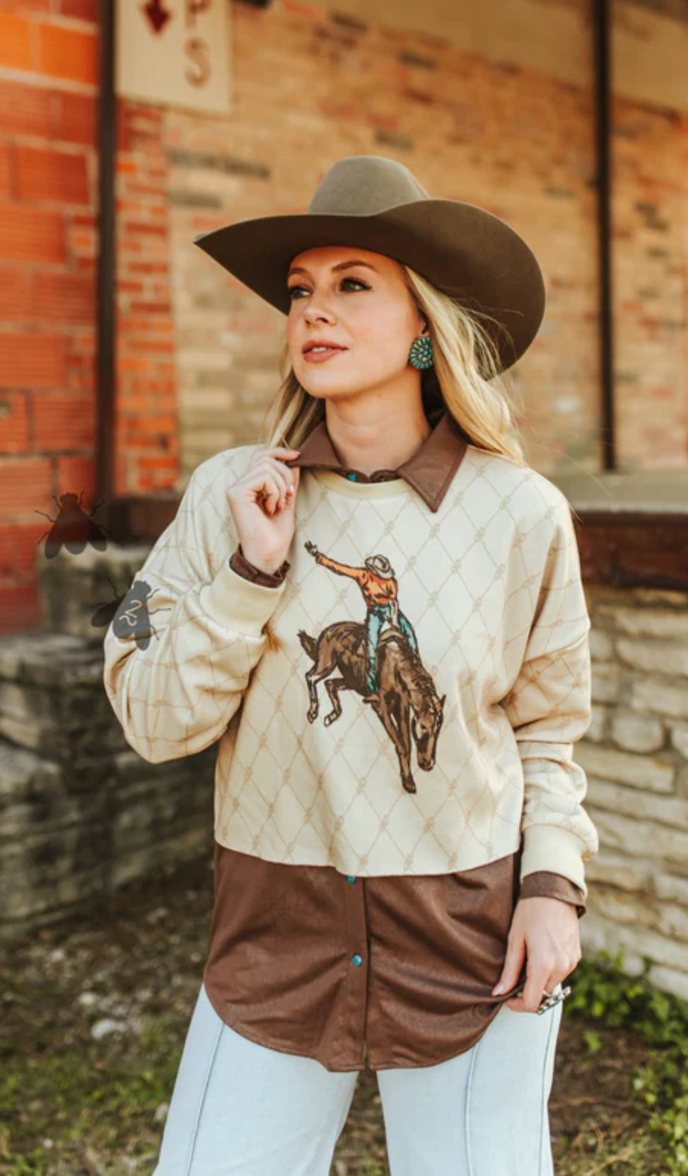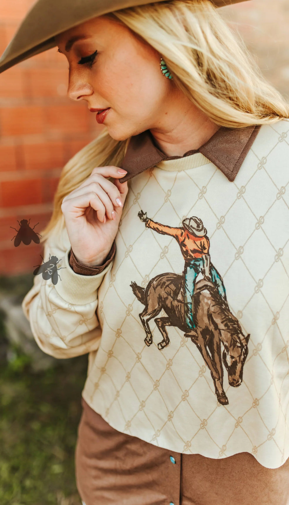 The Stagecoach Cropped Sweater is the perfect blend of western grit and vintage charm. Featuring a bronc rider graphic on a soft cream background with a subtle rope pattern, this pullover delivers that true cowgirl spirit. Finished with a contrasting brown collar and hem for a layered look, it’s ideal for pairing with high-waisted denim or suede bottoms. A standout piece for rodeo days, fall festivals, or everyday western wear.