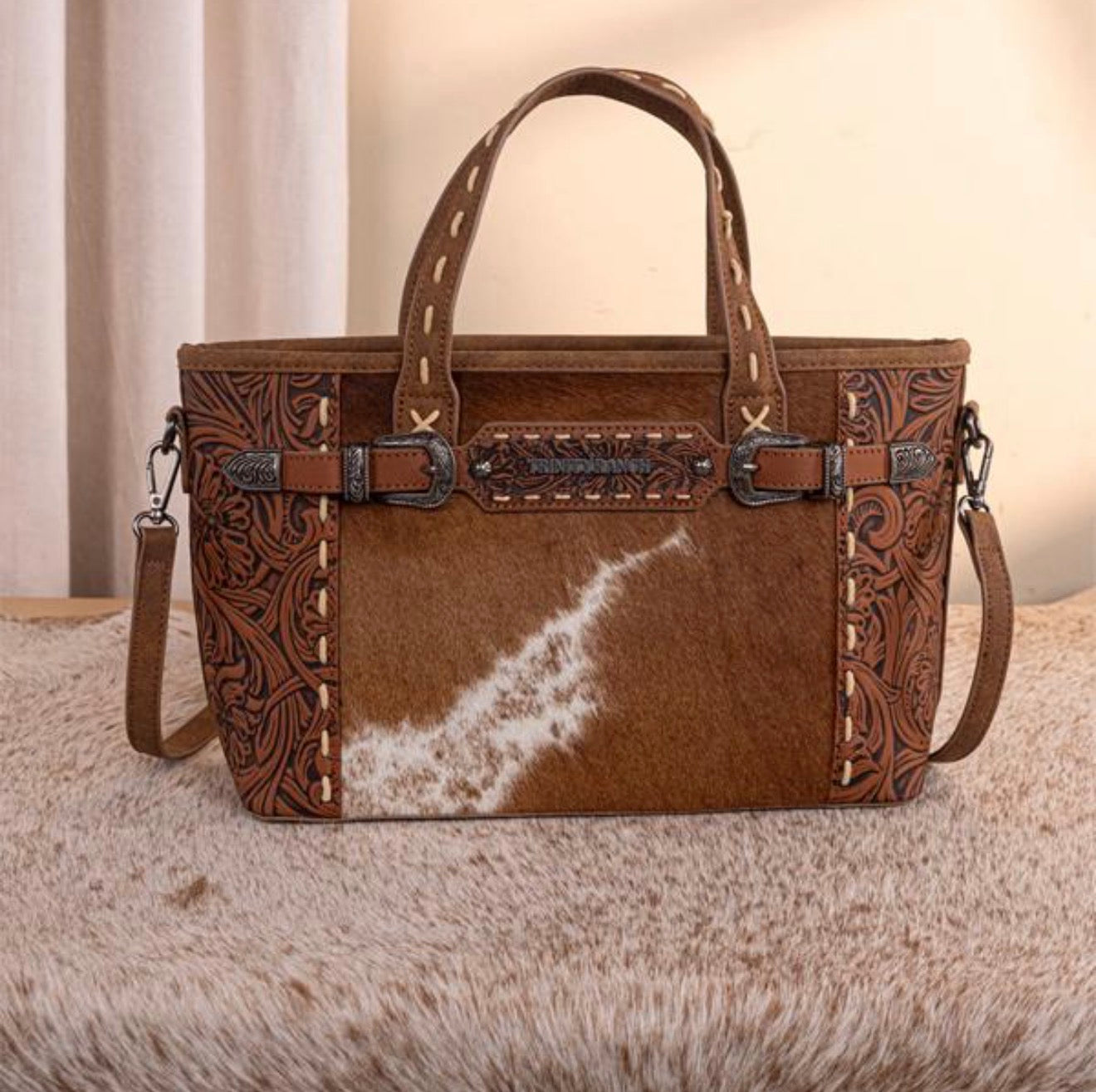 Trinity Ranch Genuine Hair-On Cowhide Tooled Tote/Crossbody