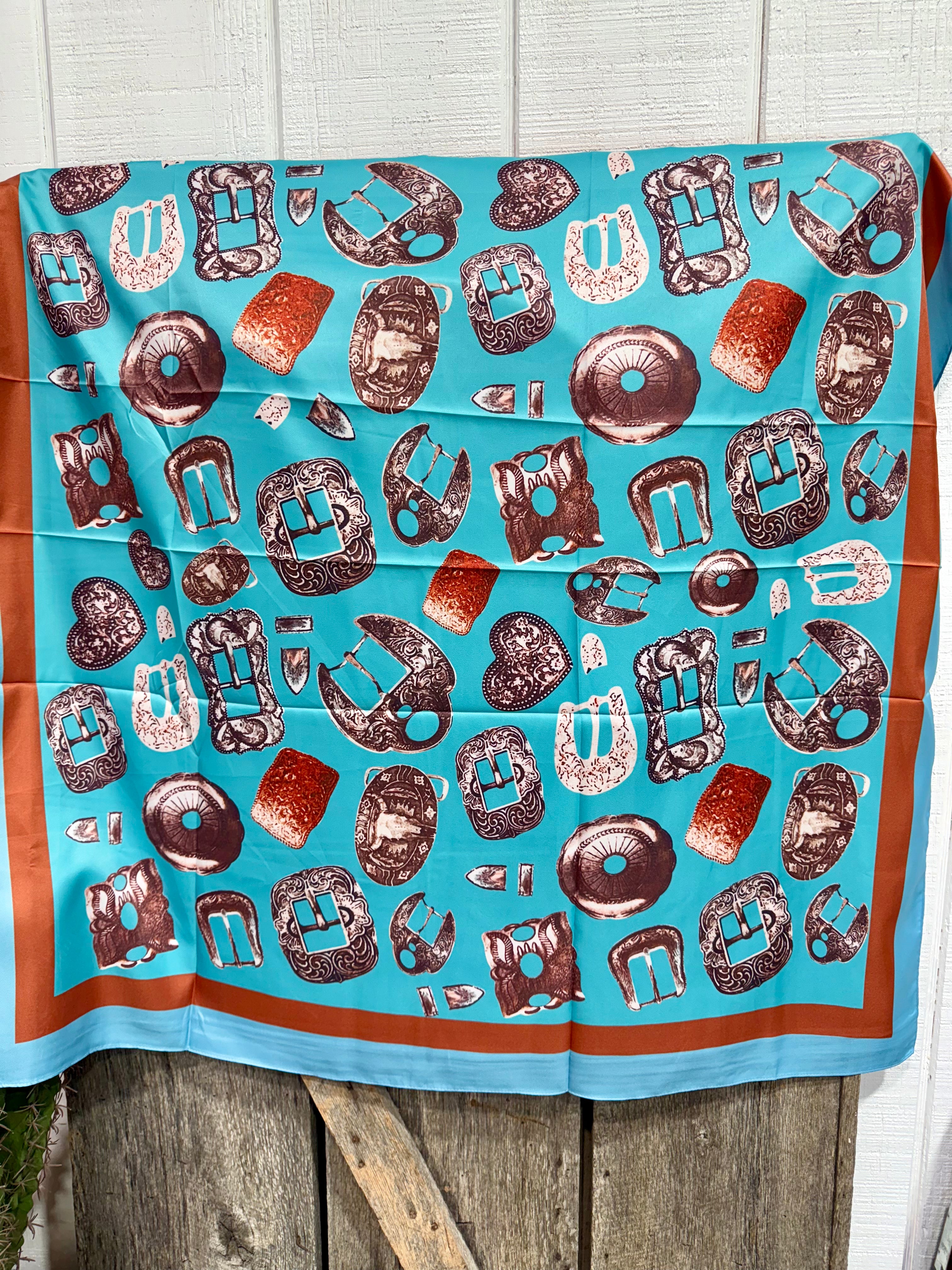Bring classic western flair to any outfit with this Western Buckle Wild Rag. Featuring a bold turquoise background with detailed tooled belt buckles, conchos, and horseshoe motifs in rich brown and rust tones, this silky scarf adds a punch of cowgirl charm. Perfect for tying around your neck, hat, or bag, it’s the ultimate statement piece for rodeo days, ranch life, or everyday western wear.