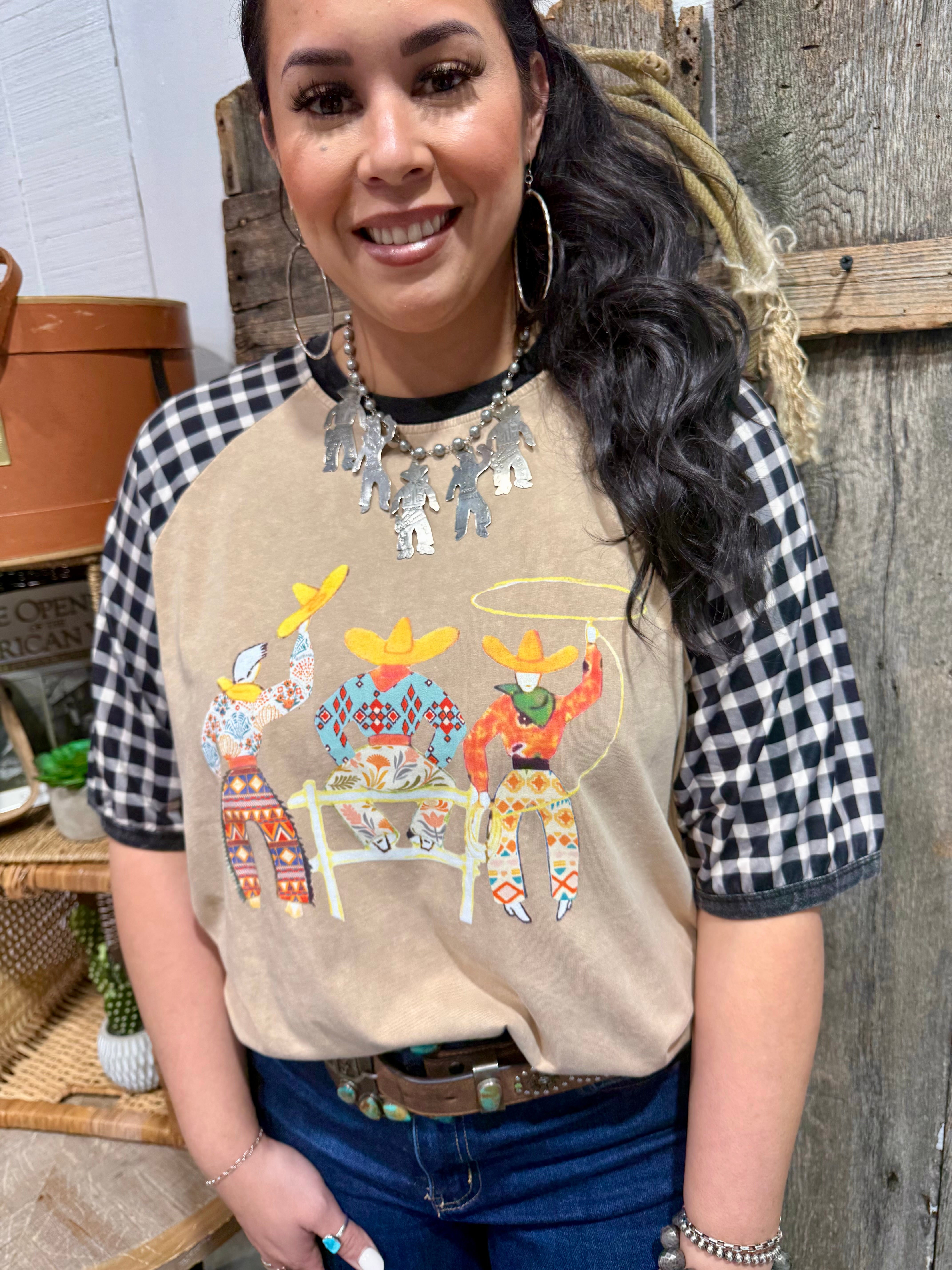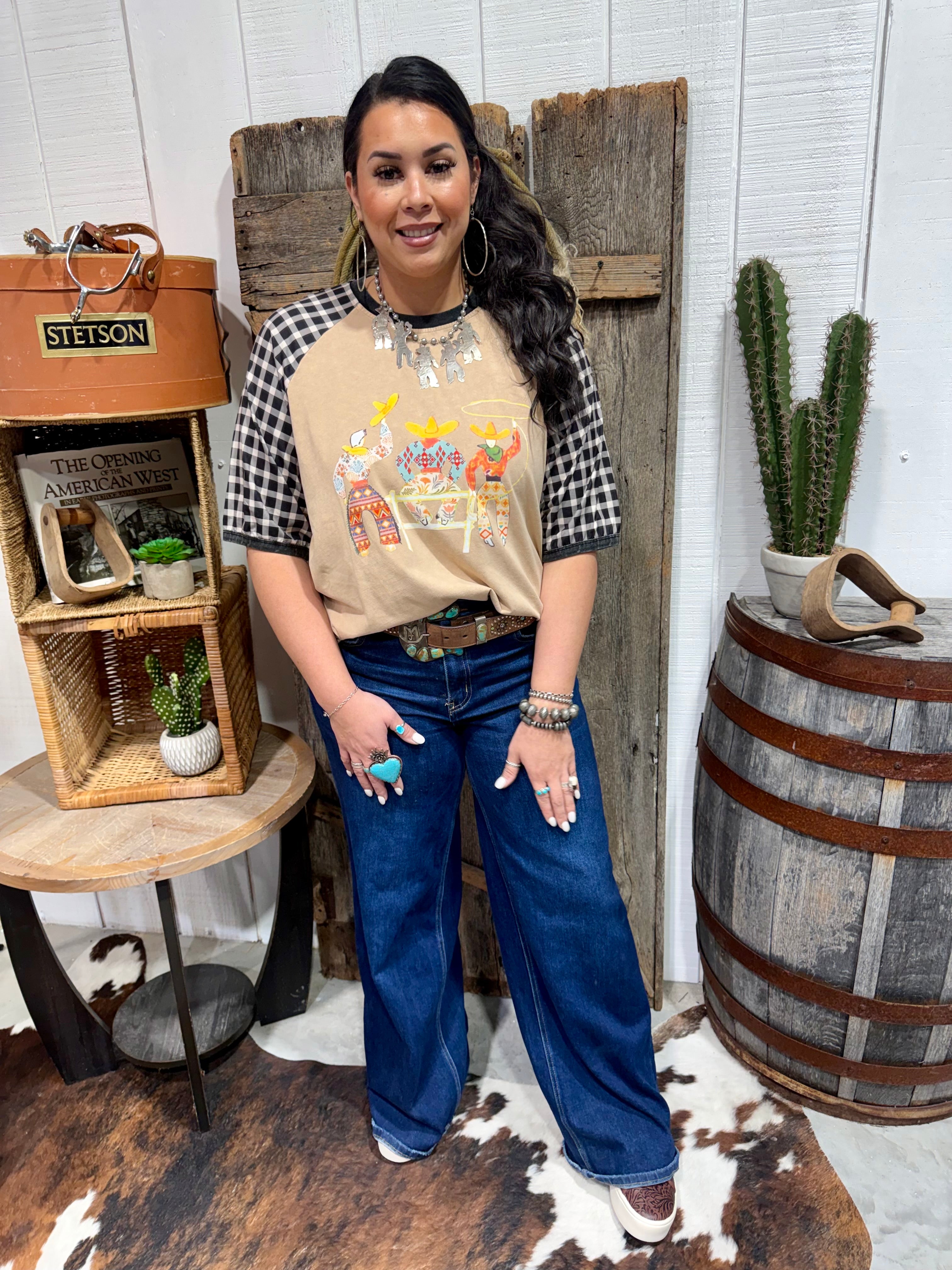 The soft sand body paired with bold black-and-white gingham raglan sleeves gives it that varsity, vintage rodeo feel that pairs perfectly with wide-leg denim, concho belts, turquoise jewelry, and boots. It’s lightweight, flattering, and made for cowgirls who love a little character in their closet.