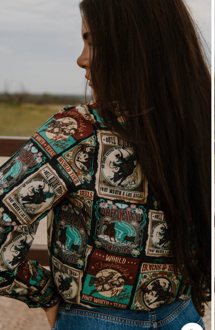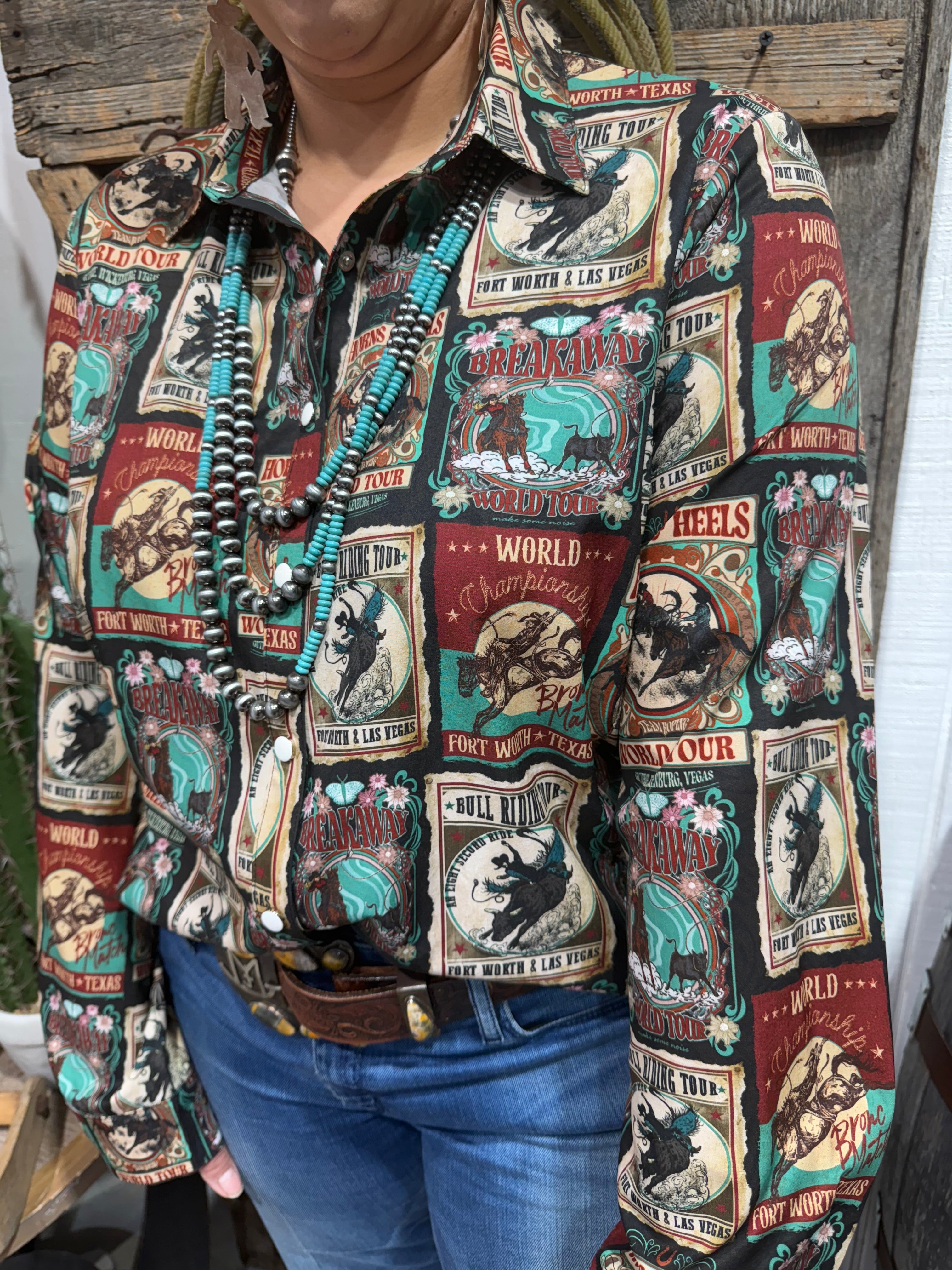 Turn heads and channel true rodeo nostalgia in our Vintage Rodeo Button Up! This standout western shirt features an all-over patch-style print with retro rodeo posters—bull riding, breakaway, bronc match, and world championship graphics in bold shades of turquoise, rust, cream, and black. It’s the perfect blend of punchy cowgirl style and vintage charm.