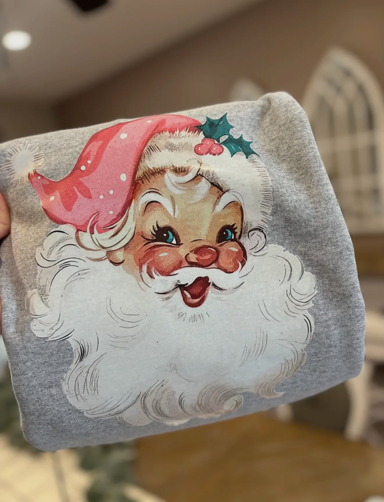 Get into the holiday spirit with this cozy gray sweatshirt featuring a cheerful vintage Santa Claus graphic. Designed with a classic retro Christmas vibe, this festive pullover brings nostalgic charm to your winter wardrobe. Perfect for holiday parties, gift-giving, or cozying up by the fire.