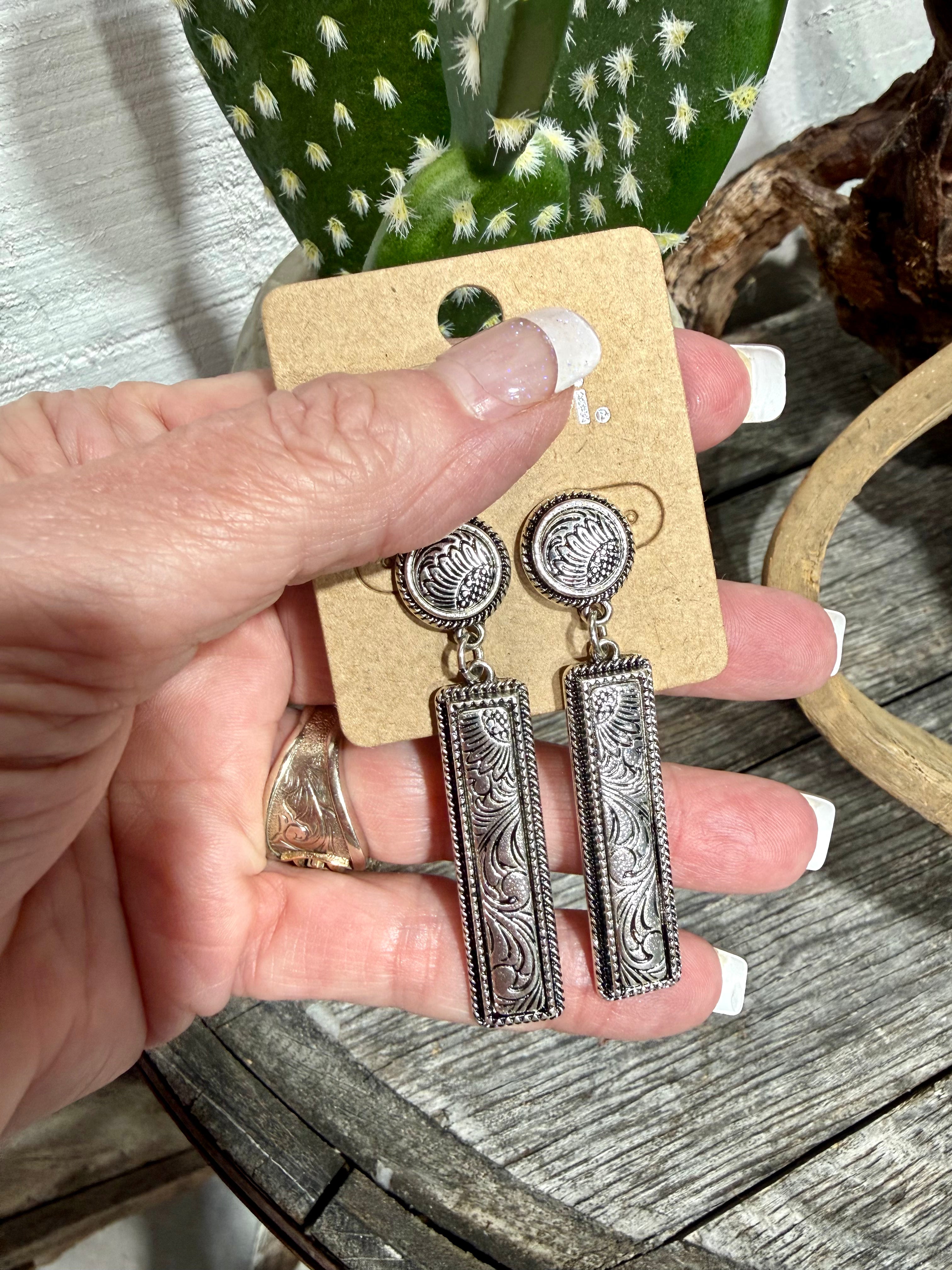Elevate your western look with these stunning engraved silver bar dangle earrings. Featuring a detailed round concho-style stud top and long rectangular drop with intricate western scroll engraving, these earrings blend classic cowgirl style with modern elegance.