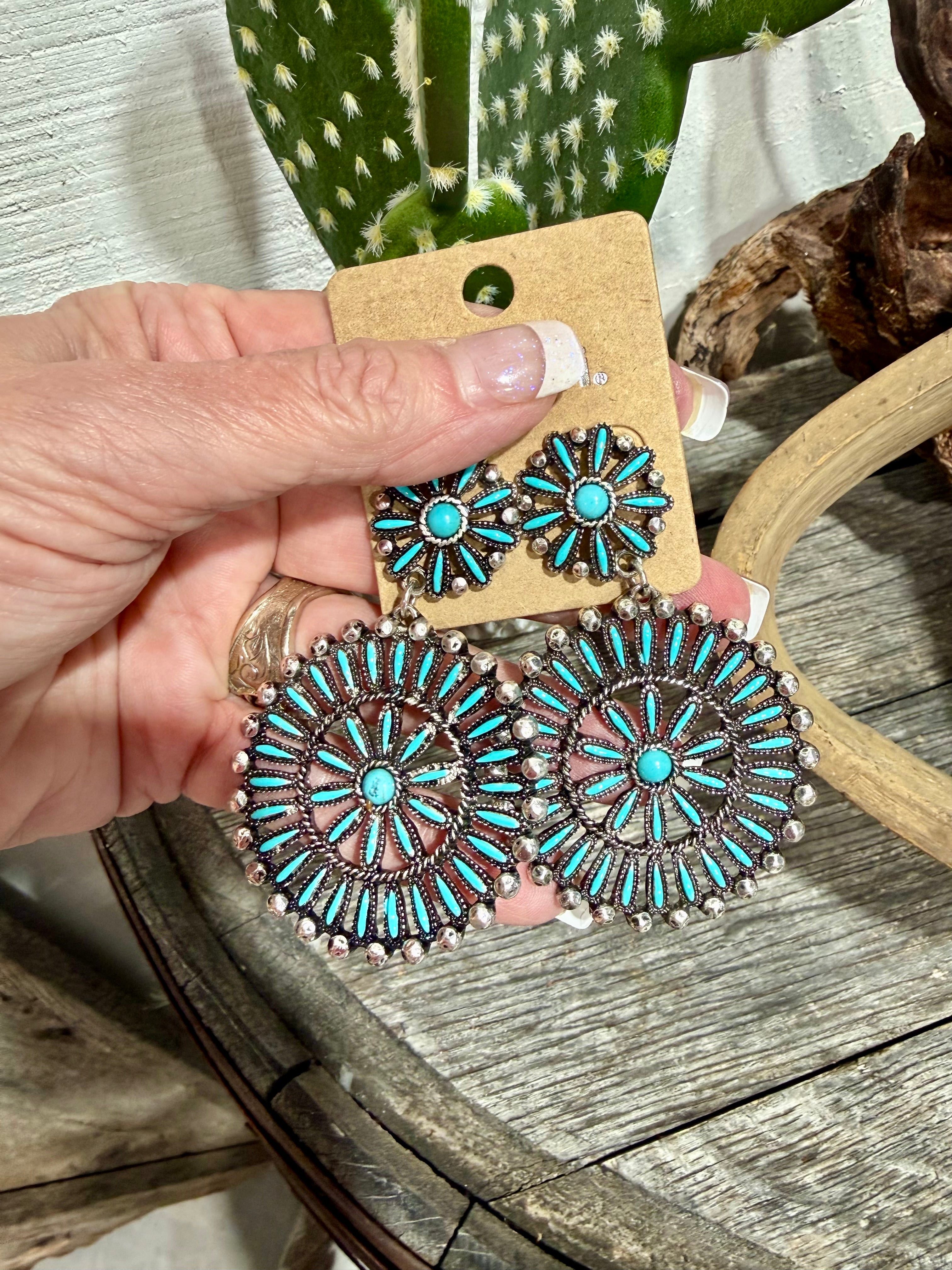 The intricate radial design and oversized silhouette create eye-catching movement, while the turquoise center stones add that classic western pop of color every boutique cowgirl loves.
